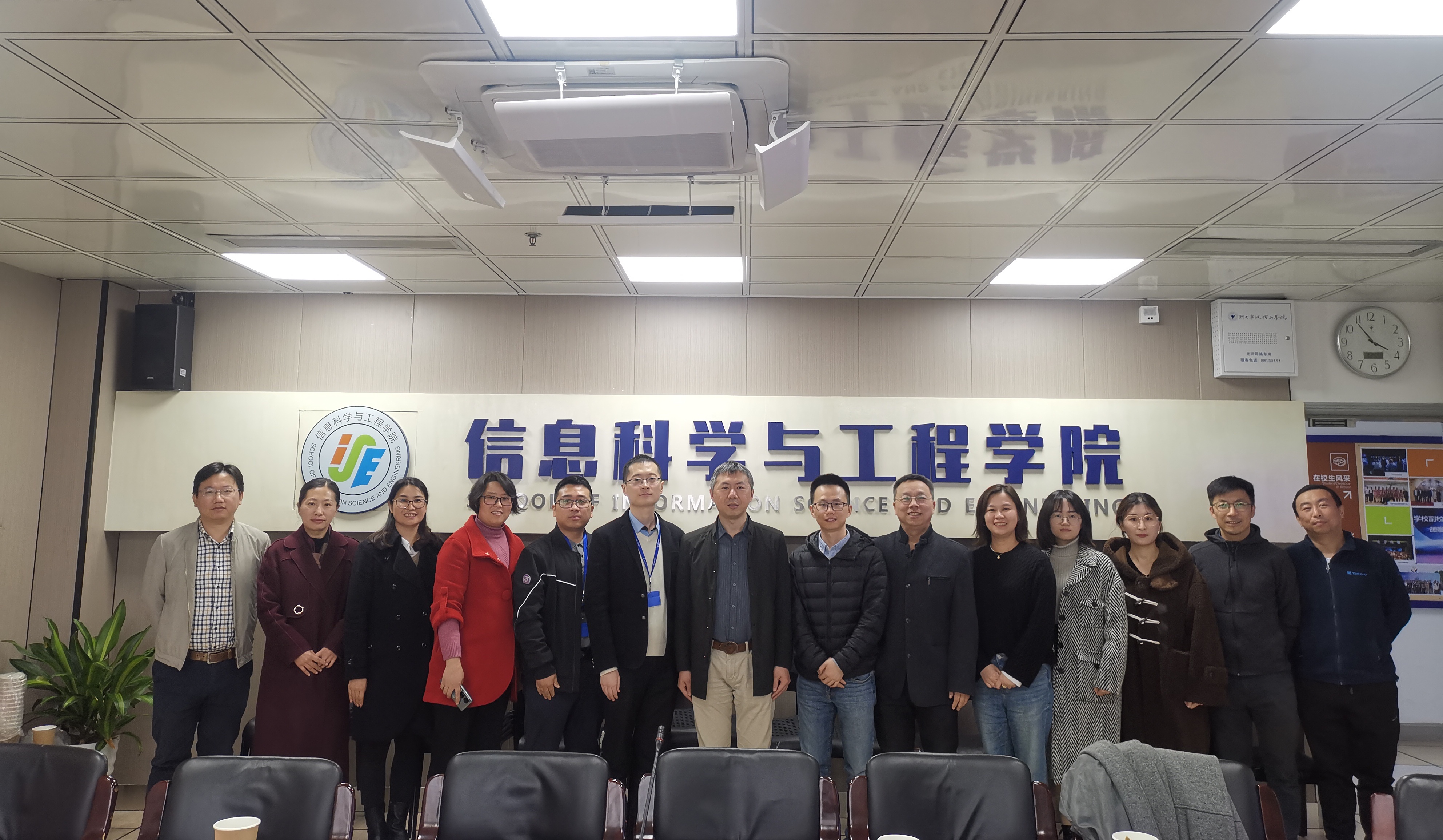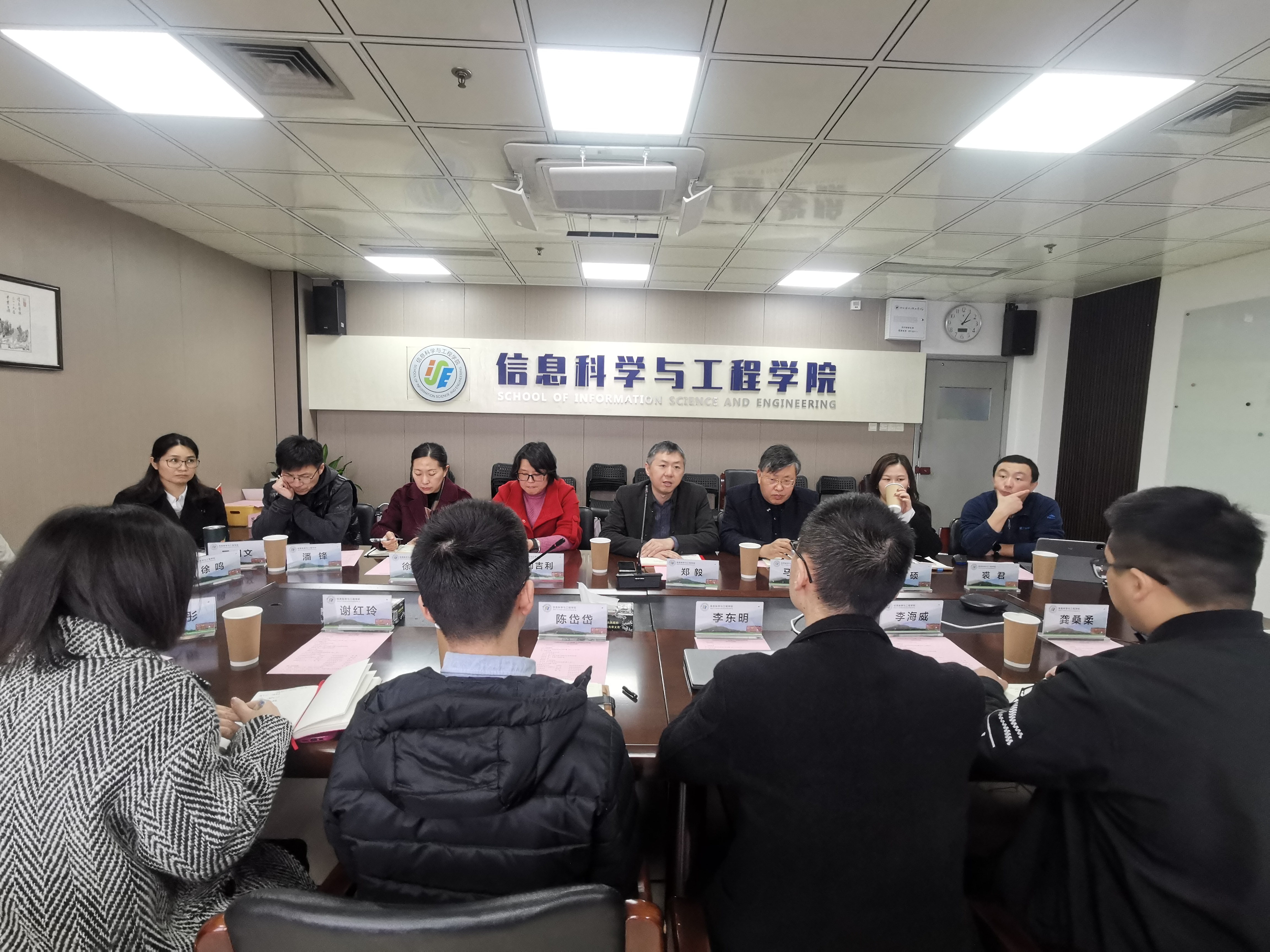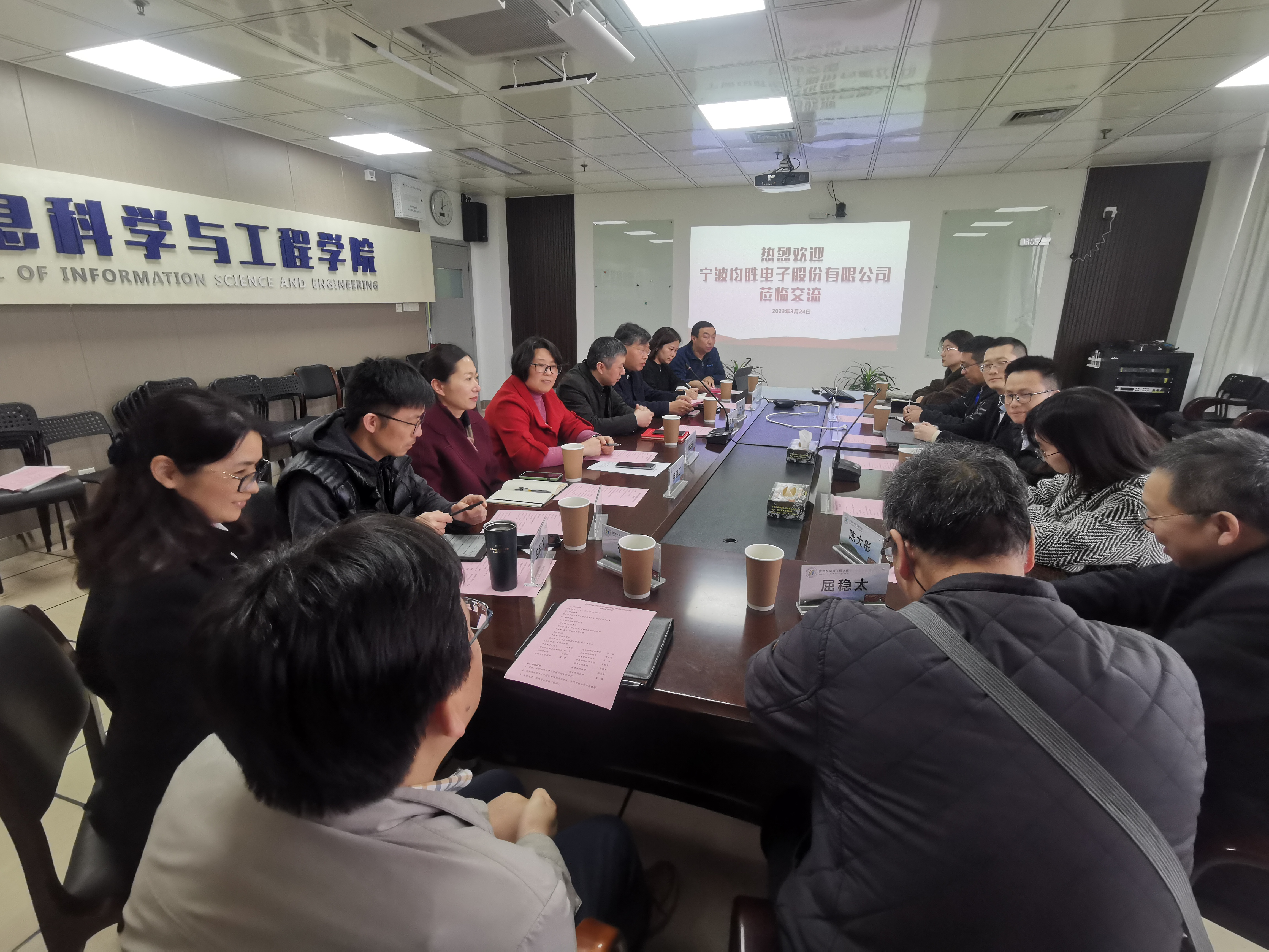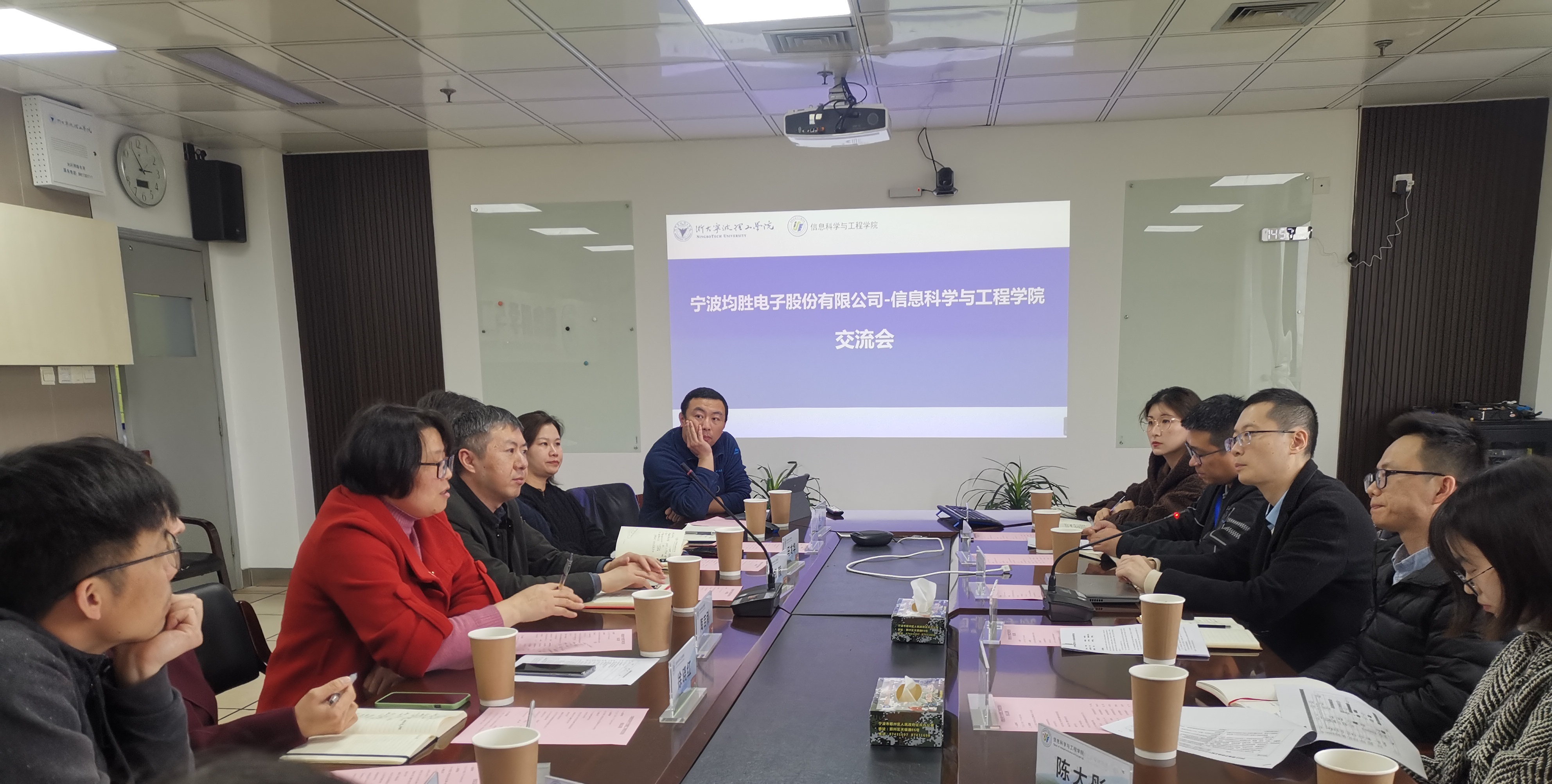 学校招就处副处长张硕、教务处徐晓红、地方合作处潘锋及信息学院领导班子和学院教授马龙华、屈稳太和教师代表徐鸣与宁波均胜新能源研究院相关负责人与专家出席此次交流会。