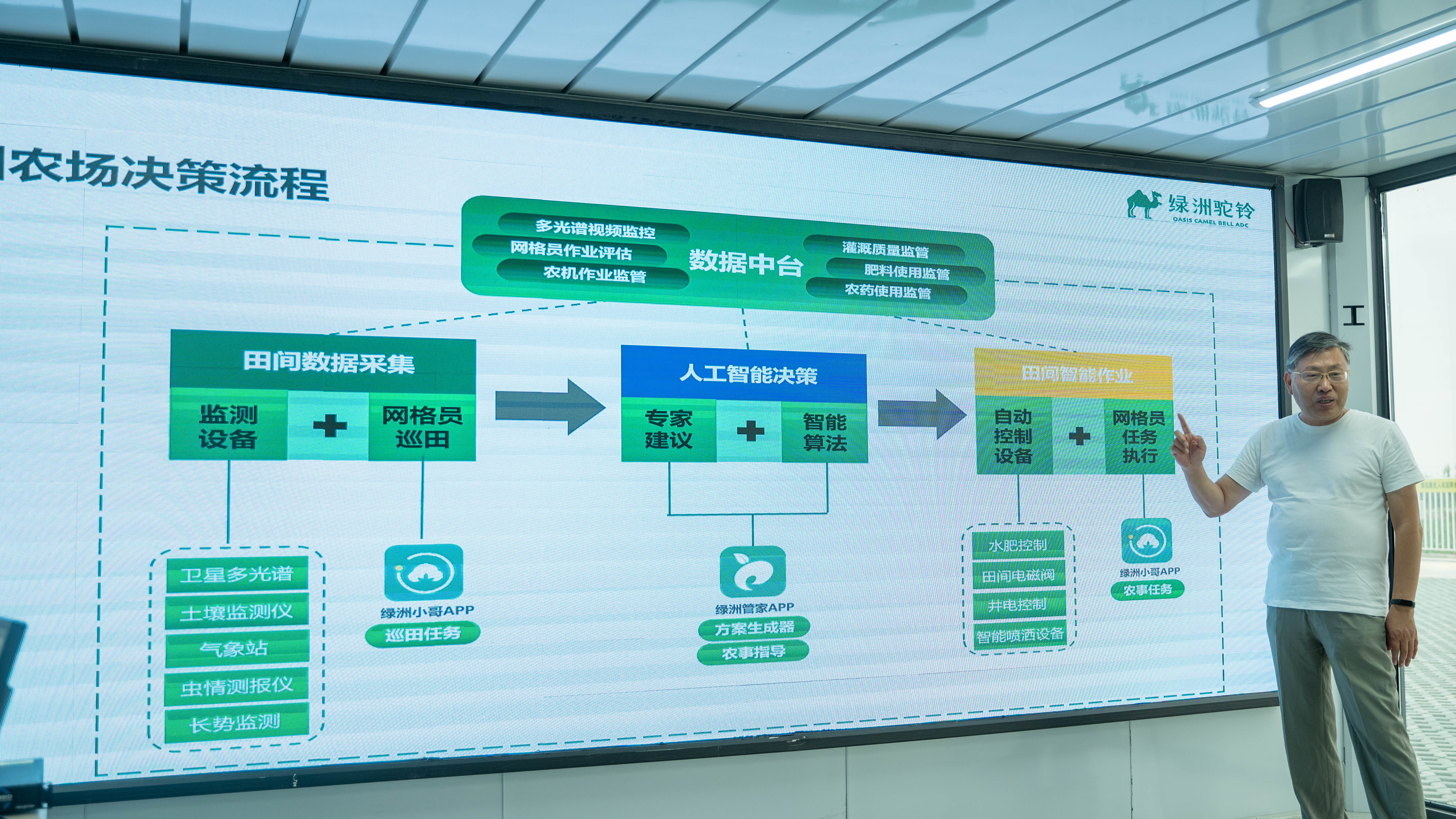“看似平静普通的棉田,其实运用到了卫星多光谱、土壤监测仪、智能气象站、虫情测报仪、长势监测、智能喷洒设备、水肥一体机、无人机等多项科技;数据平台能够进行多光谱视频监控、网格员作业评估、农机作业监管、灌溉质量监管、农药使用监管等,配套绿洲管家和绿洲小哥APP进行农事任务派发和相关农事指导。在马教授的指导和支持下,我们这套标准化的管理模式使得农场每亩田的用水可节约10%-13%,农药可节约15%-18%,化肥可节约18%以上,劳力可成本节约13%以上,产量可提高8%以上,综合效益能够显著提高。”绿洲驼铃库尔勒分公司总经理、农艺专家熊大振先生向实践团介绍道,“棉花是新疆大面积作物里面流程最长、管理难度最大、新疆种植面积最大的作物;虽然新疆各地棉田机械化、自动化的运用已经比较广泛,但是贯穿棉花种植整个流程的农艺+自动化的智慧棉田标准化建设目前还不完善,而我们在做的正是填补这个空缺,这也是我们最大的优势。”