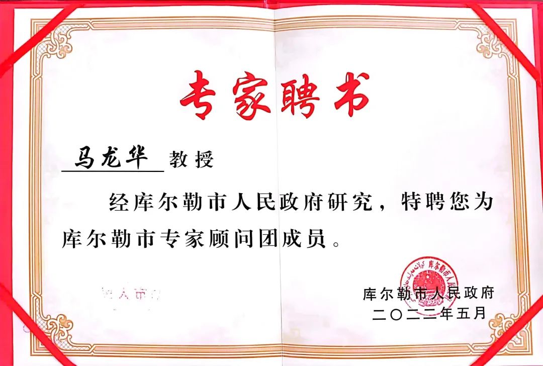 马龙华教授作为绿洲驼铃特聘专家,被库尔勒市人民政府聘用为库尔勒市专家顾问团成员。