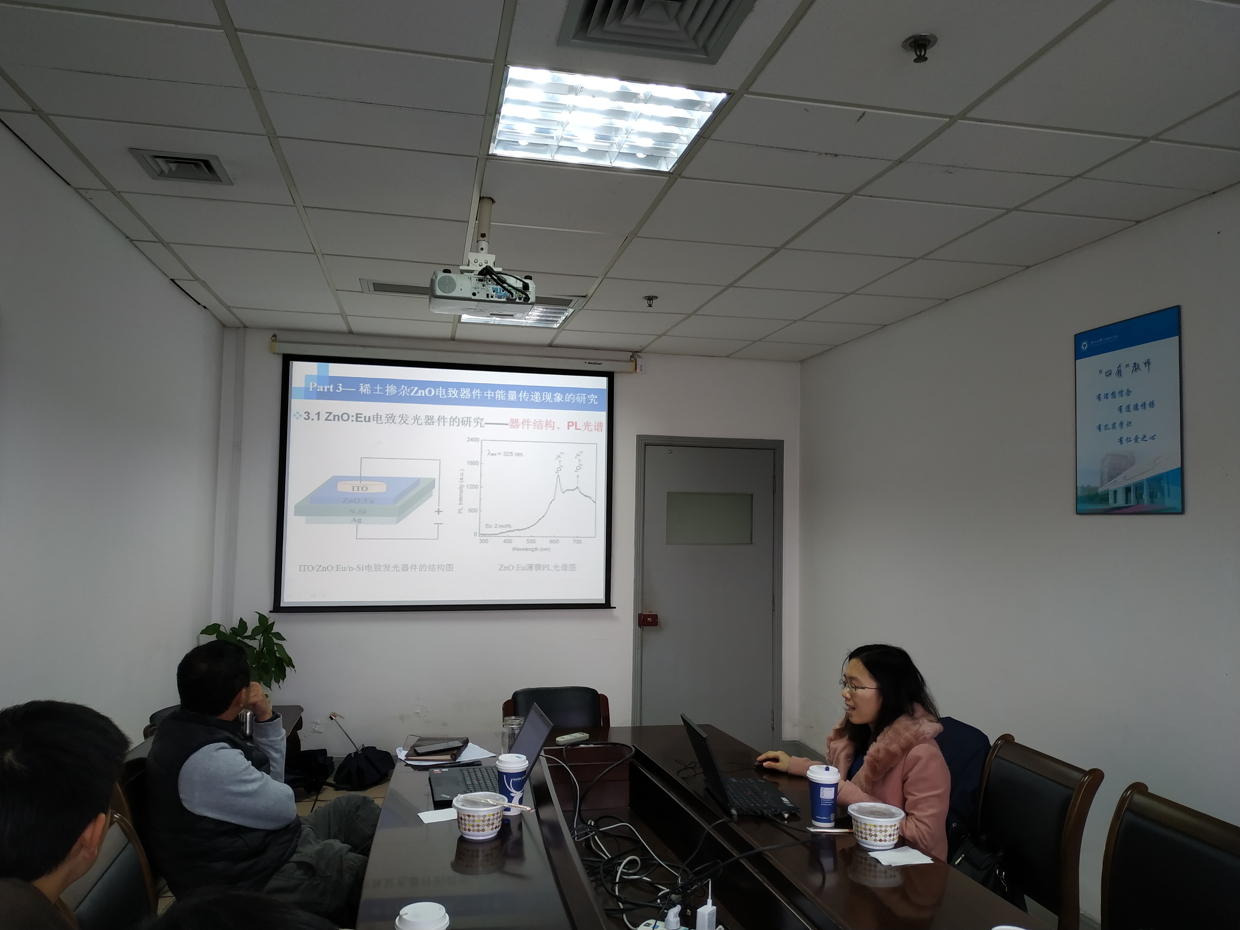黄妙玲博士报告的题目是《硅基稀土掺杂氧化锌薄膜电致发光器件的研究》,报告中,黄妙玲博士从研究背景及意义、研究内容与结果分析、结论三个方面对本次报告的内容进行了详细汇报,从显示技术的现状、三价稀土离子的发光特点、ZnO材料的优势到研究稀土掺杂ZnO电致发光器件的意义,最后对研究的结论进行了总结并介绍了该研究领域的最新进展。与会的各位老师就报告中感兴趣的问题一起进行了交流与探讨。