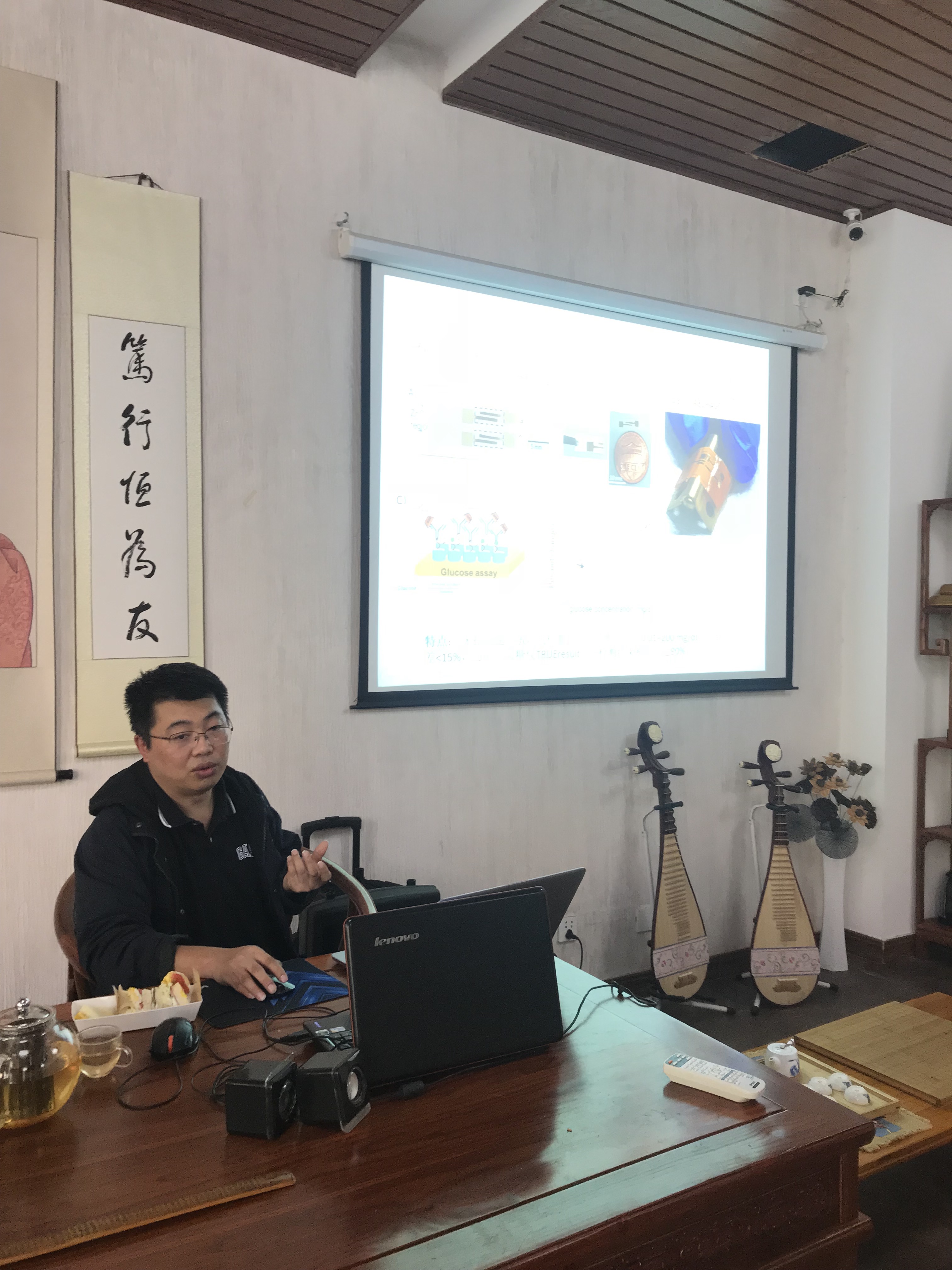 郭博士的报告主题是“生物传感器国内外主要研究进展和产业化情况”,报告中,郭博士以生物传感器在医疗仪器、食品安全和农业环境监测等领域的产业化应用为主线,分析了微纳生化传感器、MEMS、可穿戴设备、慢病即时检测、食品质量检测等方面的基本技术原理,介绍了相关技术研究近年来国内外取得的新进展,结合其自主研发的水质检测传感器、冠心病无损诊断仪、血糖及尿酸即时检测生物医学传感器的性能指标及产业化应用情况,分析了市场应用前景。参会的教师们就报告内容相关问题、传感器系统设计中的电子电路软硬件开发、微创糖尿病即时检测技术及仪器国家标准、对学生相关科研能力的培养等方面,与郭博士进行了交流与探讨。