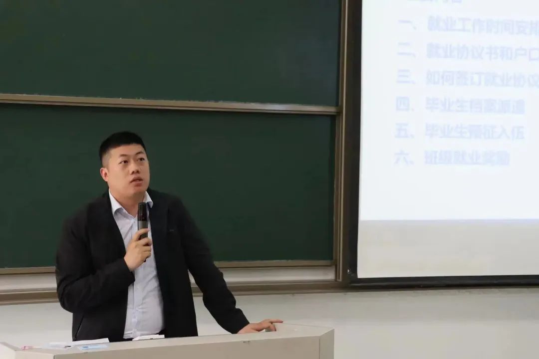 学院就业辅导员蒋鹏涛介绍了毕业生离校工作的相关安排,就毕业生签约流程、档案转接、档案户口、征兵入伍等问题进行了详细解答。