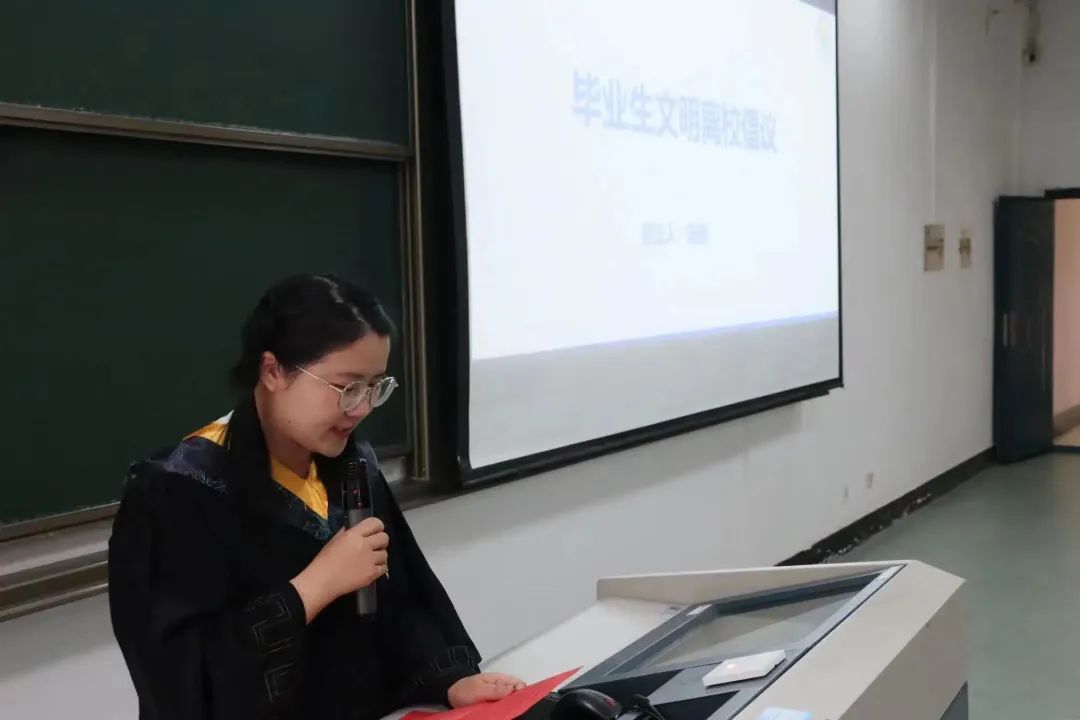 电信193班毕业生施燕发起毕业生文明离校倡议。呼吁同学们珍惜进入倒计时的大学时光,认真准备毕业答辩,积极主动就业,注意毕业季人身、财产安全。会议最后,求是191班毕业生郑晓颖带领全体毕业生进行职业操守宣誓仪式。