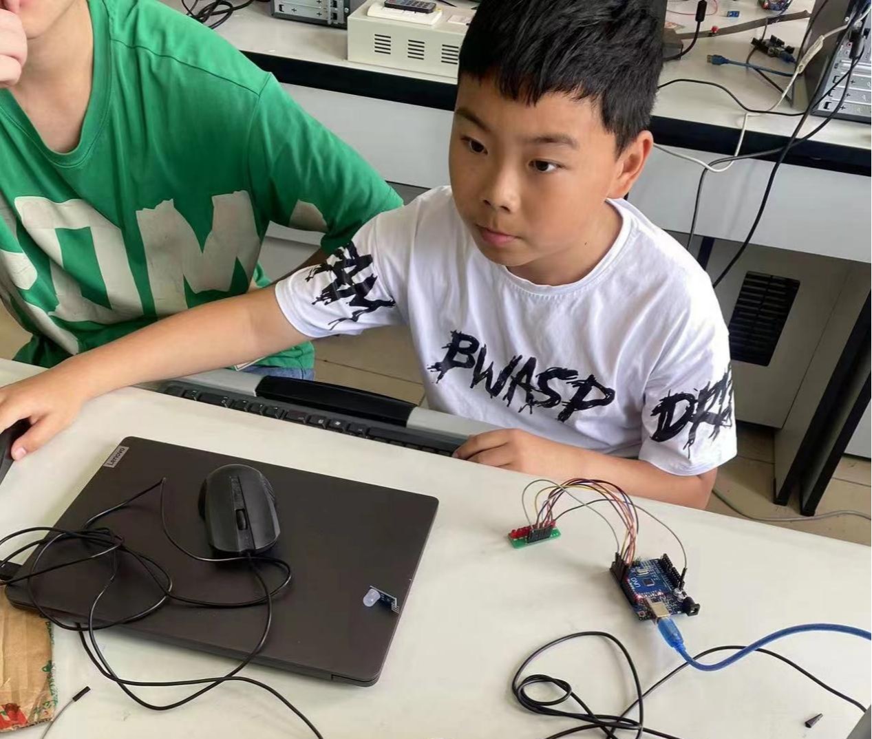一早妈妈带我们来到了教室,这里有电脑、各种电器元件、小灯泡等好玩的实验器材,还有一个小哥哥帮助我们。实验中让我意外的是:我们居然还要给实验编写程序。我第一次感受到了我学了这么久的编程有了用武之地。我们可以让一排灯按照我们的设计开关,真是太好玩了!这堂课还让我学到了各种光的知识,了解了3D电影的由来等等,最后还收到了定制版的小风扇,上面写着:“热烈欢迎励岷成小朋友参加”太开心了!