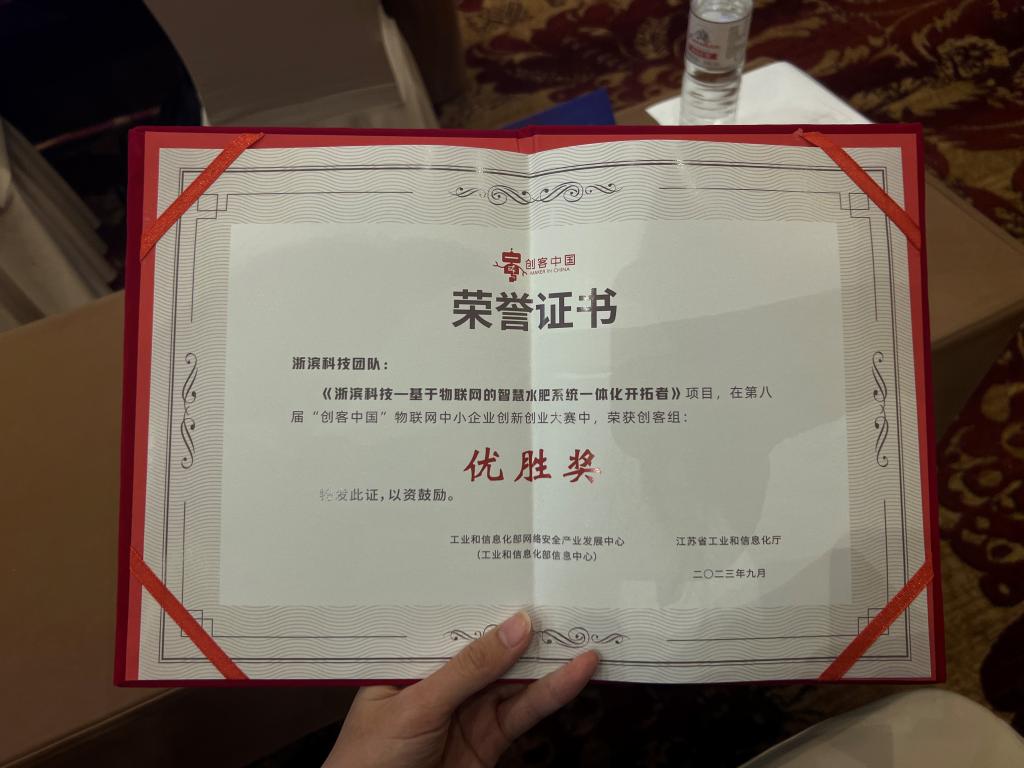 9月26日,由工业和信息化部、江苏省工业和信息化厅举办的第八届“创客中国”物联网中小企业创新创业大赛决赛在江苏省无锡市落下帷幕。经过项目全国海选、复赛和决赛,作为浙江省唯一入围决赛的创客团队,浙滨科技团队由浙大宁波理工学院信息学院电子信息工程211班胡辛梅为代表在决赛中发挥出色,以《浙滨科技—基于物联网的智慧水肥系统一体化开拓者》项目荣获了第八届“创客中国”物联网中小企业创新创业大赛创客组优胜奖(第十名),同时该项目也获得了奉化区凤麓青年农业创新创业大赛二等奖(第二名)。