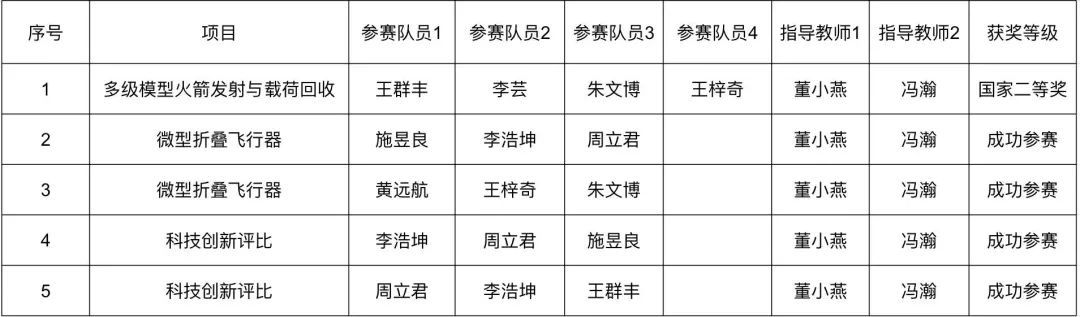 本校为第一次参加此类竞赛,由启新学院教师董小燕和信息学院教师冯瀚指导,来自信息学院的6名学生和数据学院的2名学生经过两个月的全力备战,分别参加了微型折叠飞行器,多级模型火箭发射与载荷回收,科技创新评比三个项目,最终在多级模型火箭发射与载荷回收中荣获国家二等奖,且两位指导老师被评为优秀指导教师。