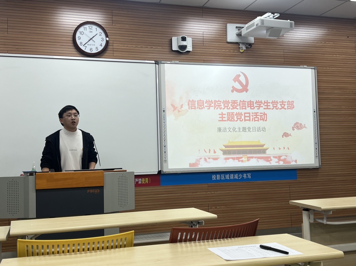 在本次党日活动中,各支部党员代表共12位分别给全体党员上了一堂生动的廉洁教育微党课。罗富同学从家风的角度切入,让大家了解到优良家风中蕴含的廉以养德、廉洁修身、廉洁齐家等价值观念,对强化个人廉洁意识、塑造廉洁品行发挥着重要作用。他强调,在新时代加强廉洁文化建设时,应注重优良家风的培育和塑造,把家风建设作为厚植廉洁文化的有力抓手。郭苗峰、王振宇等同学从廉洁文化的重要性、清廉人物典型、廉洁文化建设三个方面展开,提出建设新时代廉洁文化需要严格要求自己、诚实守信,言行一致,不弄虚作假,不欺瞒他人。阮舟同学通过分析廉洁文化的历史成因,并结合当代大学生的发展,指出廉洁文化与大学生思想政治教育、德育一脉相承,是大学生全面发展不可或缺的重要组成部分,大学生应深刻理解并践行廉洁文化,以促进个人全面发展。魏静、沈志玮等同学通过生动讲述历史人物的廉洁故事,引发对廉洁的思考,强调大学生党员应推动廉洁文化的传承,同时更应该以身作则,做到慎独,处处起到模范带头作用。