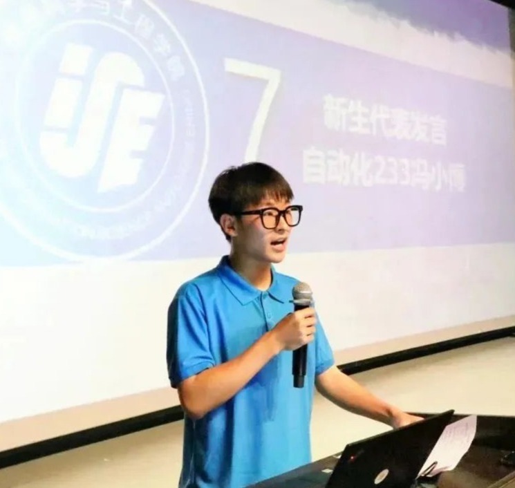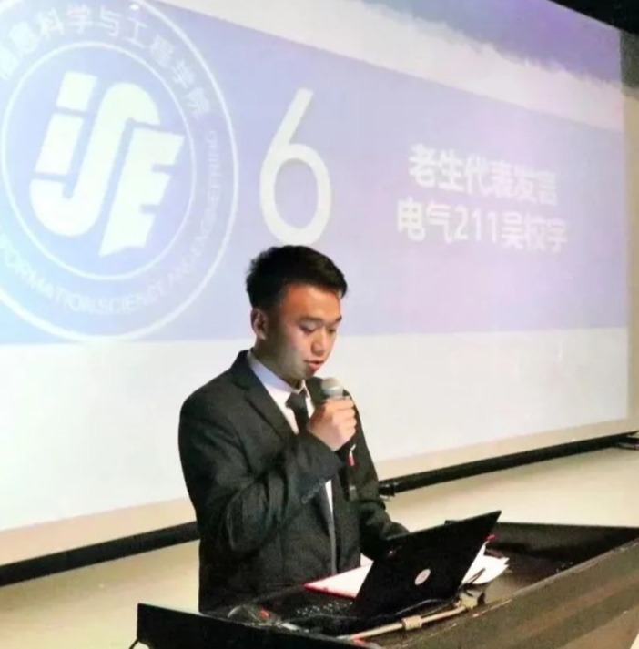 电气211班吴校宇同学作为老生代表以个人经历出发,从专业学习、学科竞赛、部门社团工作等多个方面向新生们分享了自己的收获和心得,鼓励学弟学妹们在信息学院不畏困难,勇敢追梦。