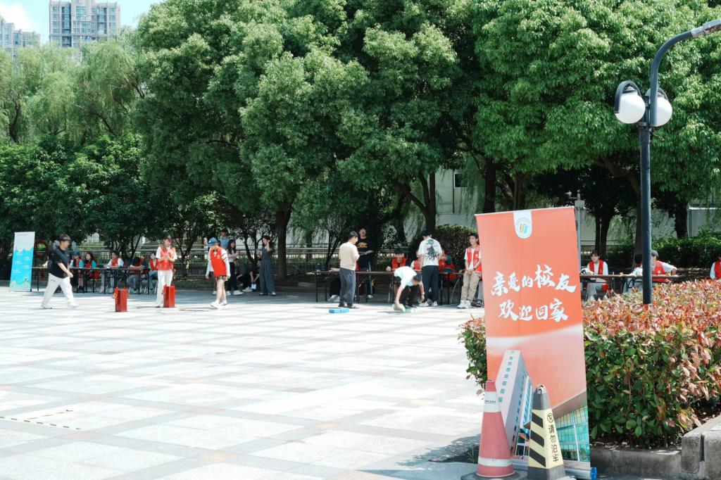 当满面春风的校友们踏入熟悉的校园时,浙大宁理校园早已准备好热情的怀抱迎接他们的到来。上午8:30,在学校西门接待站,信息学院辅导员和志愿者们早早准备好迎接远道而来的校友们。