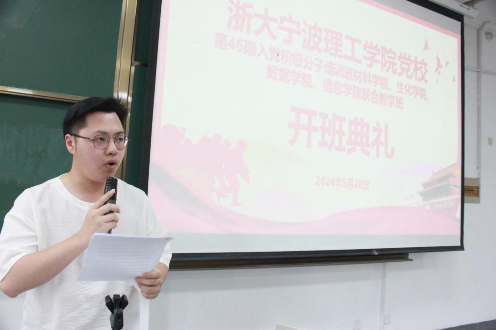 为进一步提高入党积极分子对党的认识,端正入党动机,坚定理想信念,树牢“四个意识”,增强“四个自信”,5月29日党校第46期入党积极分子培训班材料学院、生化学院、数据学院和信息学院联合教学班顺利开班,信息学院党委书记郑毅、党委副书记马利文,生化学院党委副书记王常青、数据学院党委副书记赵红、材料学院思政主管包静昇、生化学院思政主管闫雪茹、数据学院组织员楼佳丽等参加了此次开班典礼,仪式由信息学院思政主管董俊娜主持。