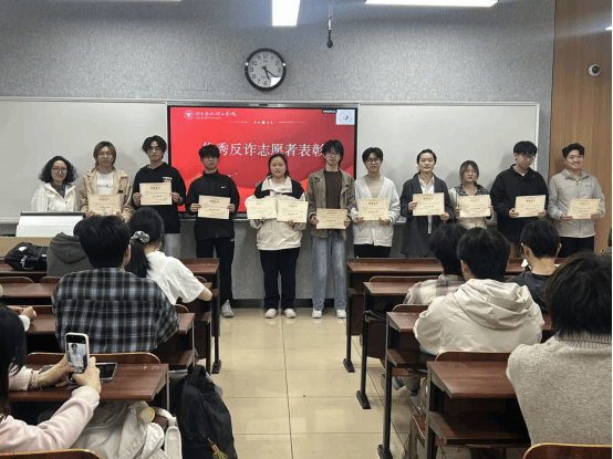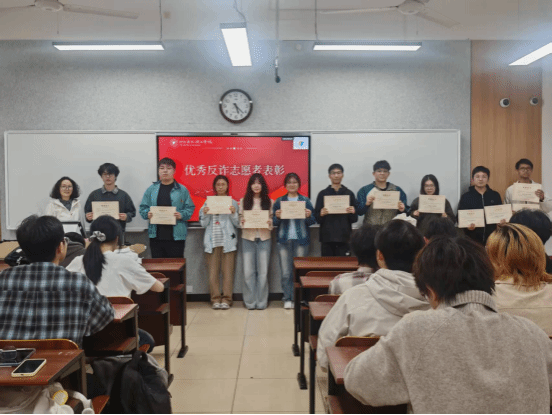 紧接着,学院对过去一段时间在学院反诈宣传工作中表现突出、成效显著的优秀反诈志愿者进行了表彰,为其颁发荣誉证书。通过表彰先进、激励后进,进一步凝聚志愿者队伍力量,激发全体志愿者投身反诈工作的积极性和主动性,营造“比学赶超”的良好氛围。