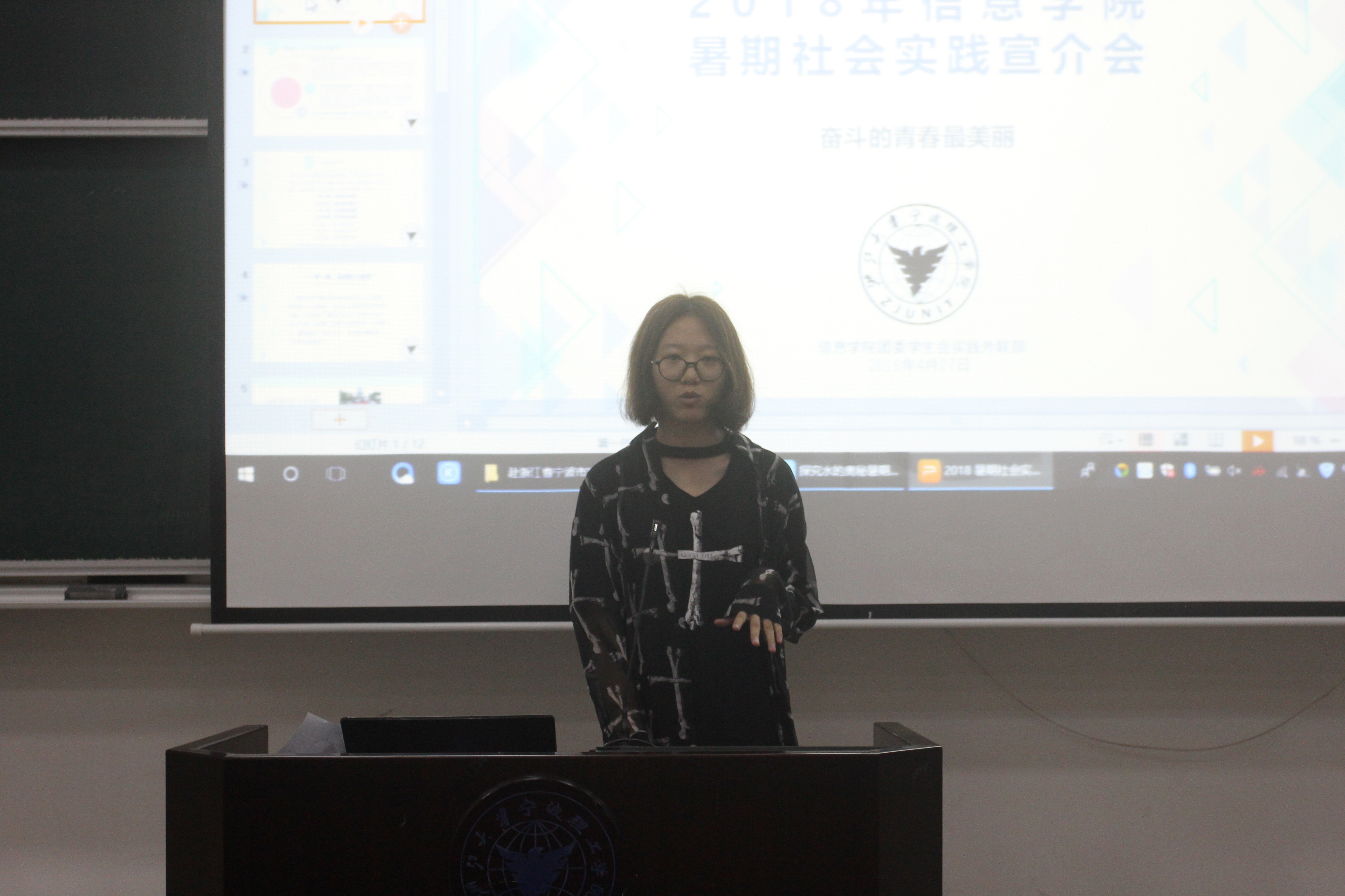 为了顺利进行2018年暑期社会实践,信息学院于4月27日晚6时30分在NC102举办暑期实践宣介会,信息学院团委书记龚欣欣老师、2017年暑期社会实践优秀个人代表俞洪伟同学、郭梦娜同学、数据学院优秀团队代表吴长聪同学、法政学院优秀团队代表徐铭萱同学、土建学院优秀团队代表叶夏云同学以及2017级全体同学出席了此次宣介会。