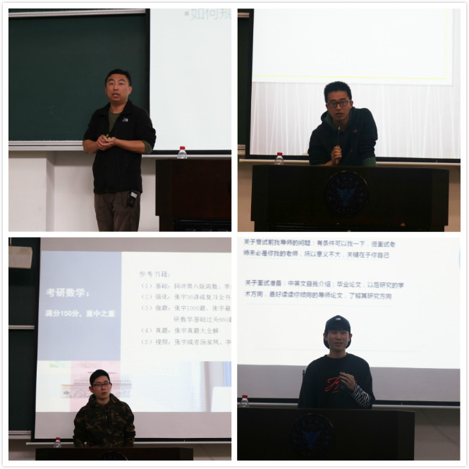 首先裘君老师首先做了考研动员讲话,他为全体同学介绍考研对于日后的生活会有何影响。无论是从社会环境,工作的薪资,考研都是一条合理的道路。同时也解决了同学们心中对于考研的畏惧心理,让同学们知道考研并没有想象中的那么困难,还让同学们了解工科类学生在考研上有何优势。随后刚录取杭州电子科技大学、上海电力学院、宁波大学研究生的3位2014级同学从报考流程、专业选择、复习方法与技巧、复试面试要点等多角度,为在座学弟学妹们分享了自己考研过程中的点点滴滴,并为同学们推荐了一些实用的考研复习资料。几位高年级同学不谋而合鼓励考研的学弟学妹们,在考研的过程中要保持良好的心态,从一而终,只有不断坚持才能成功。刚录取宁波工程师学院的毕业生校友罗将城的倾情讲述更是让同学们受益匪浅,他深刻剖析了自己就业4年后再次鼓足勇气踏上考研之路的心路历程,真诚的告诉同学们考研对于职业发展和人生规划的重要性。考研不仅是学历的提升,人生境界、眼界的拓展,更是自我成长与提升的一次质的飞跃。