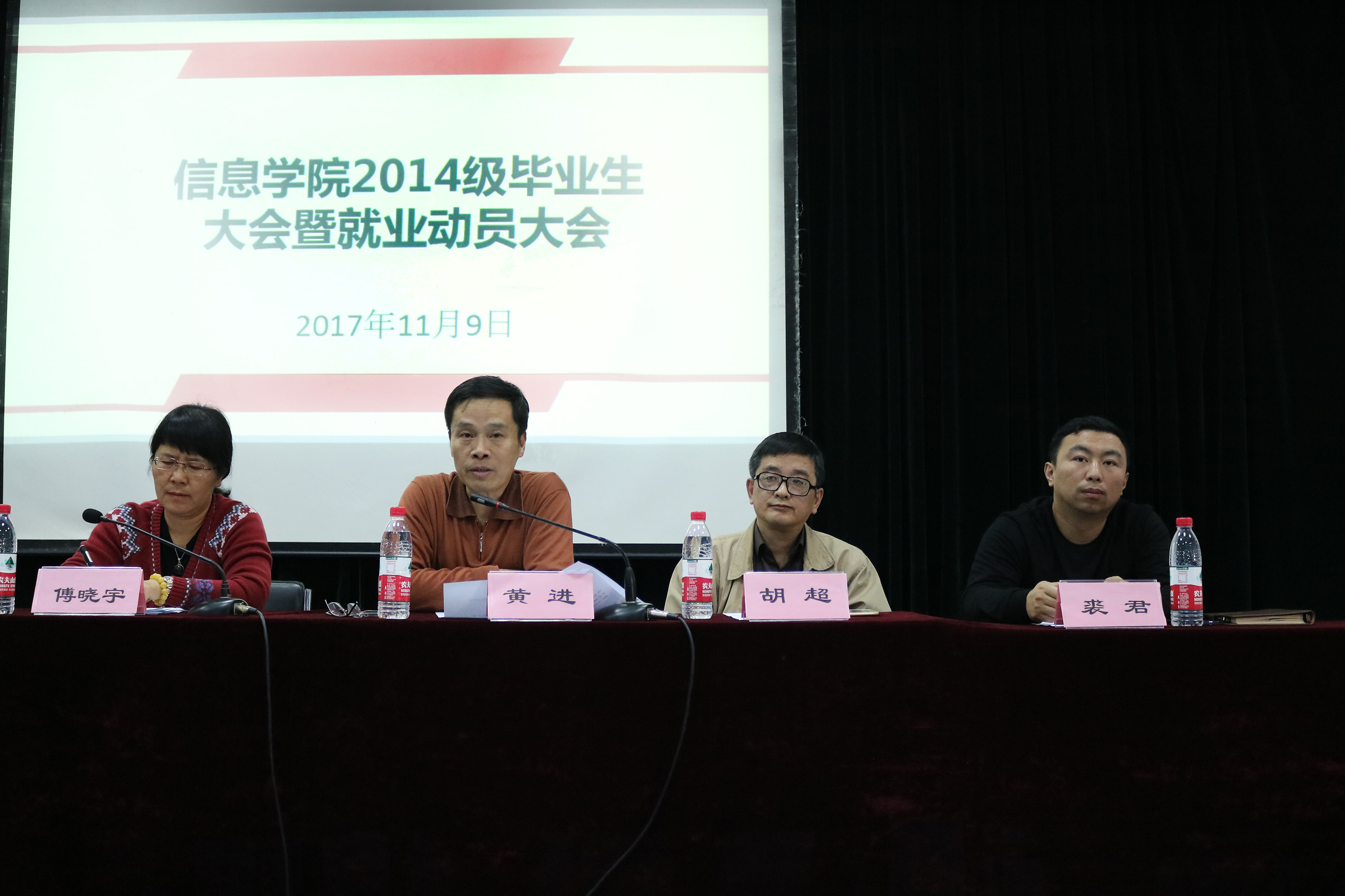为帮助毕业生树立正确的择业观,指导学院毕业生顺利就业,信息学院于11月9日下午15点30分于NF103召开信息学院2014级全体学生大会暨就业动员大会,信息学院院长黄进老师、党总支书记胡超老师、党总支副书记傅晓宇老师、院长助理裘君老师,学院学工、教务相关老师以及毕业班班导师出席此次会议。