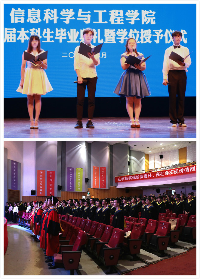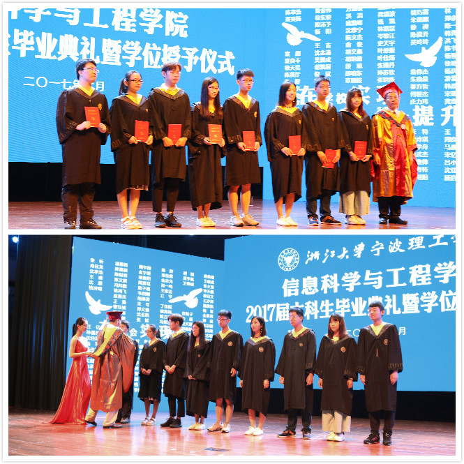 随后,在庄严的国歌声中,典礼拉开了帷幕。首先,陶吉利副院长宣读了毕业学生名单,并为各班毕业生代表颁发了毕业证书;随后党总支书记胡超老师宣读了省级、校级优秀毕业生名单,并由黄进院长为校优颁发了证书,学校副院长杨建刚教授为省优毕业生颁发了证书并合影留念。紧接着,院长助理裘君老师对信息学院国内外升学的毕业生进行了表彰,并表示了衷心的祝贺。
