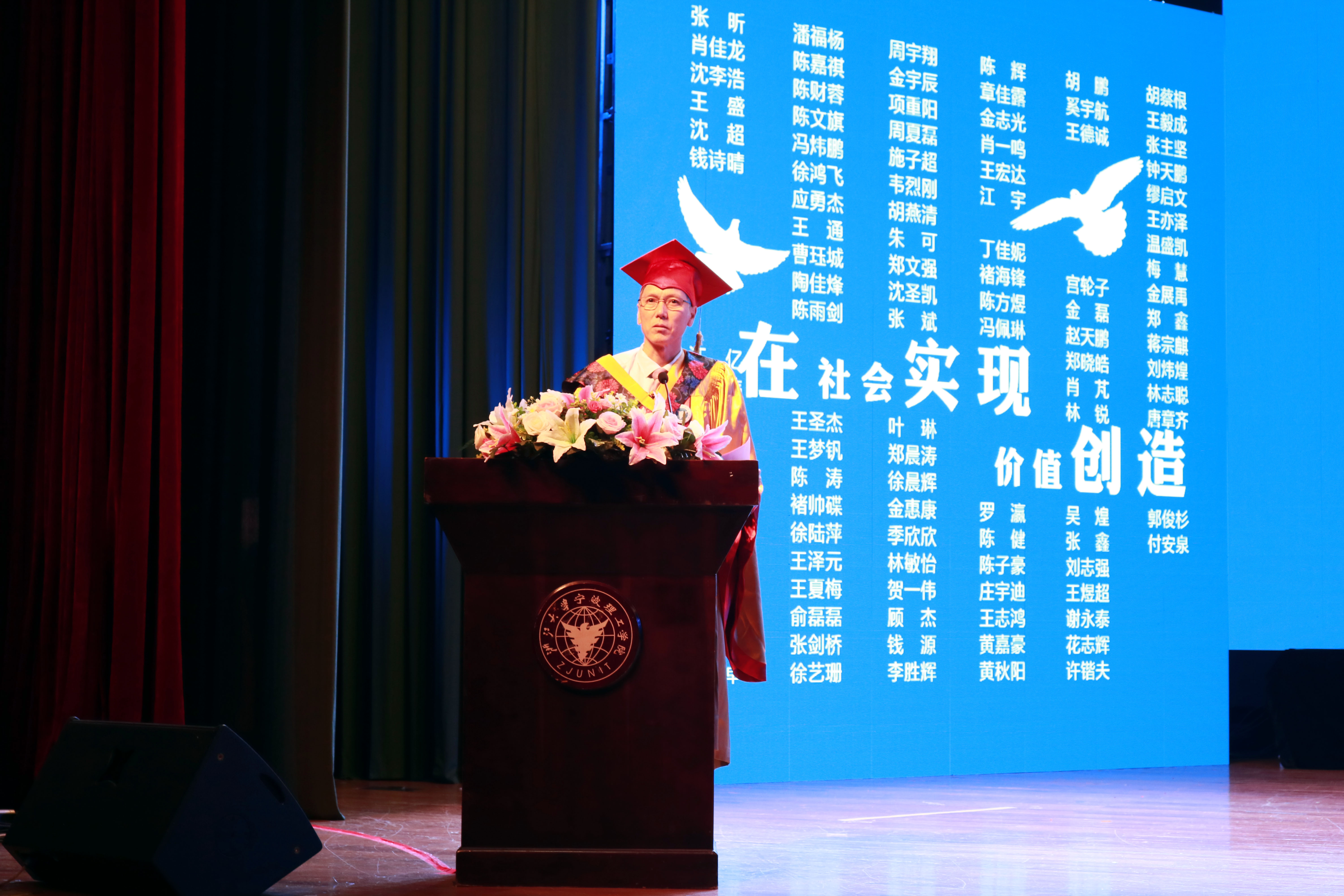 毕业班班导师朱勇老师作为教师代表进行了发言,他表达了一名师长对与即将踏上社会的毕业生们的谆谆教诲与浓浓祝福。随后,毕业生代表徐鸿飞同学的发言回顾了自己大学四年一路走来的心路历程,以及此刻对于大学的深深眷恋和感激之情,感谢母校,母校让他学会成长与珍惜。