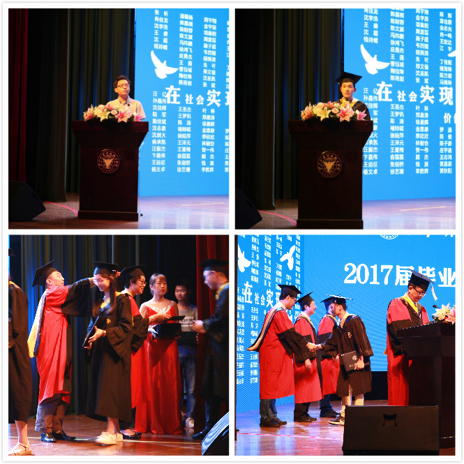 随后,学校副院长杨建刚教授代表学校致辞。杨副院长对2017届毕业生表示衷心祝贺,作为师长他结合自己的人生阅历对整装待发的毕业生们提出了几点叮嘱:希望毕业生们“不忘初心,坚守青春的理想”,同时要“不懈追求,在实践中磨砺成才”,更要“不怕挑战,给自己多一份责任与担当”,希望同学们毕业走向社会后,能承受起时代赋予的使命,担当起社会进步的责任,在人生之路上,“不忘初心,砥砺前行”。