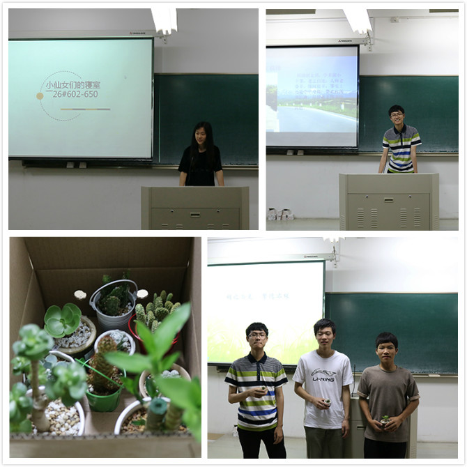 此次活动中,每一位寝室代表都利用精心准备的PPT向在场的同学展示他们寝室的风采。在一场场时而生动有趣,时而严肃认真的展示下,在场的同学们都深深体会到了寝室文明建设的重要性。一张张奖状、一份份优异的成绩单,都令在场的同学赞叹不已,也让同学们体会到寝室环境对学习的必要性。最后,每一个参赛代表都获得了一盆小盆栽,用来点缀寝室。通过本次活动的开展,各寝室成员在合作中增进了对彼此的了解、深化友谊,进一步融入寝室生活。