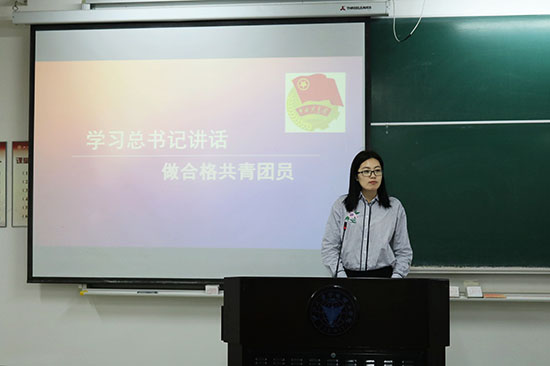 团课在庄严的入团誓词中拉开序幕,在全体学员起立奏唱团歌后,团委书记龚欣欣老师致辞。龚欣欣老师以“学习总书记讲话,做合格共青团员”为主题为我们讲解中国共青团的性质以及发展,以及五四青年节时习近平总书记在中国政法大学的座谈内容展开讲解青年的目标和责任,并对在座的各位团员提出来明确的要求,希望大家能够在以后的学习生活中严格要求自己。同学们在演讲中收获深刻的领悟。团课期间,优秀团员代表顾敏娜同学进行发言,她的演讲说明团员与团课的关系以及接受团课教育的重要性。最后,组织部部长吕亚璐同学围绕着“一名合格的团员应该具备哪些条件”进行的发言。同学们在团课中颇为受益,进行了认真的思考。