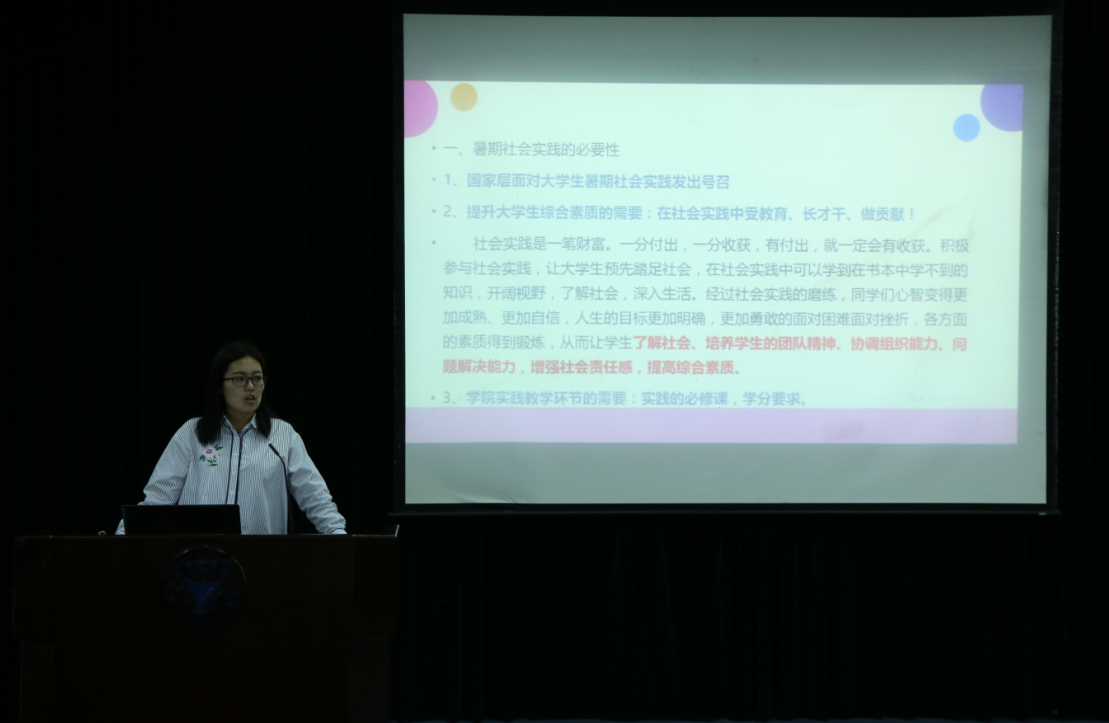 宣介会期间,龚欣欣老师围绕暑期社会实践活动的重要性和必要性,进行详细阐述,并指出,在暑期社会实践中,同学们可以学到在书中所学不到的知识,能开阔眼界,了解社会,深入生活。同学们的团队精神、协调组织能力、问题解决能力,社会责任感在这次实践中都能够得到一定的提升。龚欣欣老师还对暑期社会实践活动的具体内容及要求做了介绍,使同学们更加了解暑期社会实践活动的相关事项。紧接着,去年优秀暑期社会实践代表周科迪同学和朱赟海同学为在场观众介绍他当时的暑期实践活动经验和心得,为即将开展的暑期社会实践活动提供了指导和建议。