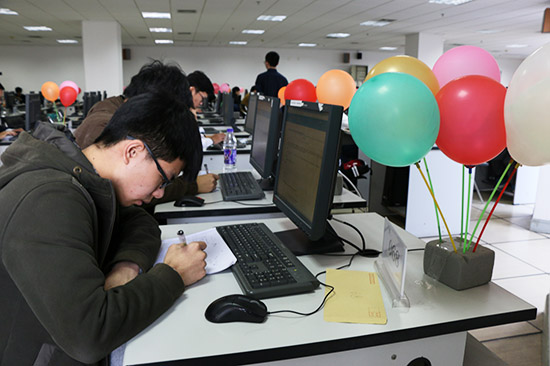 比赛开始前,志愿者们精心布置好比赛现场,准备好所需道具。11时45分,选手们开始入场就坐,为接下来的比赛做最后的准备。正午12点整比赛正式开始,现场的气氛瞬间紧张起来。选手们沉着应战,整个赛场只剩下敲击键盘和点击鼠标的声音。随着时间的流逝,越来越多的选手做出了正确答案,并拿到对应题目的彩色气球。比赛临近结束,在这紧张的氛围下,赛场上已有一些选手放弃作答,当然也有一些选手旁边已经插了五、六个气球,但更多选手还仅有二、三个气球。最后随着一声信号响起,比赛结束,参赛选手全部关闭程序,收拾东西,依次离开赛场。