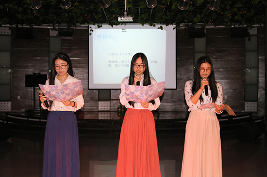 在这五月,我们有的不是六月的离别,而是人生的风景。晚会的第一个节目是由信计142班的张钰和戚天鹏同学表演的小品《聪明的小明》。有趣的对话,生动的表演引起台下的同学的阵阵笑声。紧接着进行第二个节目,由信计142班周杰同学带来表演《B-BOX》,带动了晚会的氛围。在两个精彩的节目之后,主持人邀请了七位观众上台参加游戏《钱钱抱团》,最后两位女生和一位男生赢得最后大奖,充满欢乐的游戏将晚会的热度带到又一个高潮。在晚会的后半段,由信计14、15级的同学为毕业生们带来了深情款款的歌曲《再见》,幽默搞笑但又富有深意的小品《招聘》,令人动容的大合唱《同桌的你》,以及诗朗诵《毕业季》。动情的朗诵,一字一句都紧扣毕业生的心弦。晚会在到场的老师的恳切的寄语中结束。