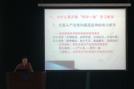 5月25日晚上、5月27日下午,信息学院分别召集全体教工党员和全体学生党员,召开学院“两学一做”学习教育专题党课暨动员部署会。党总支副书记张杰讲党课,并就信息学院开展“两学一做”学习教育作了动员部署。