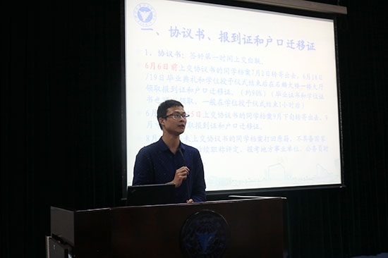 会议开始,由邬旭东老师对此次大会进行相关介绍。随后由徐升槐老师就毕业设计前后毕业资格审核、电子离校系统的操作以及毕业证书和学位证书的发放进行了细致的讲解。之后,邬老师又对协议书、报到证和户口迁移证、毕业生预征入伍、改派以及就业奖励的相关事宜进行说明。