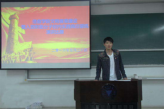 5月20日下午,信息学院举办文明寝室建设暨校园实践岗位锻炼演讲比赛,共有12位入党积极分子参加此次演讲比赛。此次演讲比赛由电气支部党员钱鹏程主持。信息学院思政主管王常青老师和信息学院辅导员徐益亮老师以及信息学院各支部党员代表、80多名入党积极分子参加了此次演讲比赛。