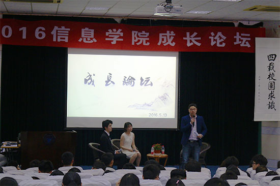 为了给广大学生提供一个与优秀人物对话的平台,从创新实践、创业发展等方面给大学生指引方向,信息学院于5月13日下午在NF103举办第十二届成长论坛。信息学院特邀学校团委副书记李炜老师和2001级校友俞锋、2003级校友高黔作为该活动嘉宾。除特邀嘉宾以外,信息学院学工办思政主管王常青老师、信息学院团委书记邬旭东老师、信息学院团委副书记丁志远老师、信息学院辅导员徐益亮老师、龚欣欣老师以及信息学院全体大一学生参加该活动。