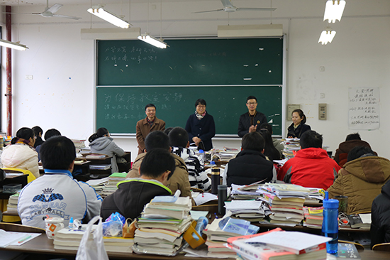考研教室里静悄悄的,桌子上堆满了考研资料,学生们低头读书,为即将到来的考试努力奋斗着。下午两点,老师们悄悄推开了教室门,打破了教室的沉寂,老师们带着水果、牛奶等慰问品来慰问奋战中的同学们。老师与同学们分享了自己的考研经历以及自己所了解的身边人的考研经历,用事实来鼓励学生。老师们向考研的学生们提出了自己的建议,鼓励学生们不要轻言放弃,坚持便会成功,并提醒同学一定要注意心态的调节同时保持身体健康,不要过于劳累,还告诫同学谨遵考场纪律。最后,老师们真心祝愿学生们能考出理想的成绩。学生们用掌声来表达对老师的感谢和一战到底的决心。