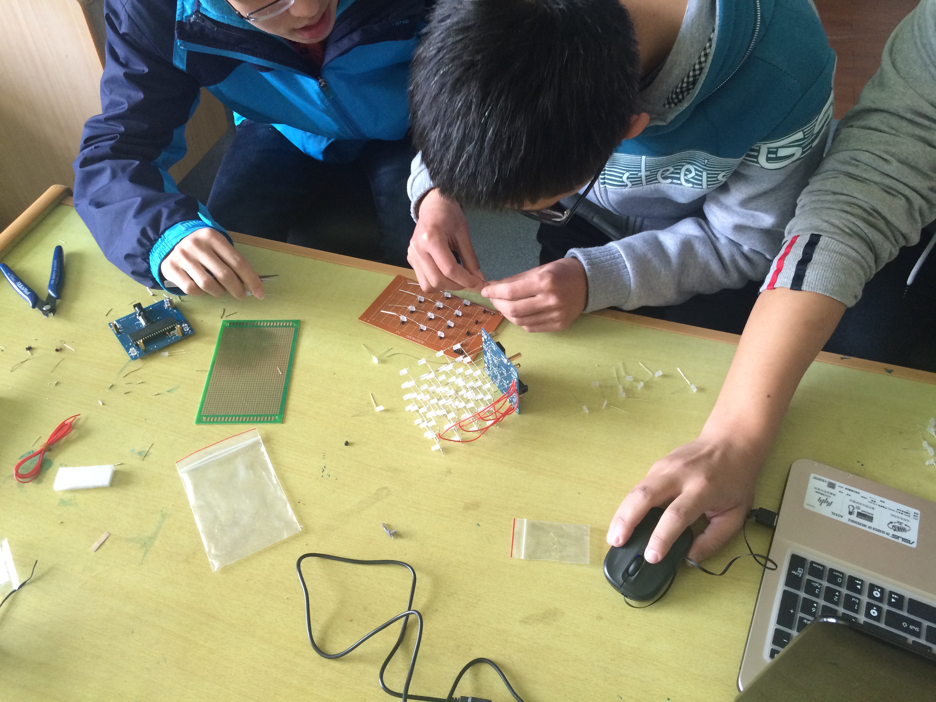 本次计算机协会教学活动选用的光立方是4*4*4基于51单片机的DIY电子设计套件,主要由64个单色蓝光的LED灯和STC12C5A60S2单片机组成。活动正式开始前,每组成员在实验室外集合,然后统一进入实验室。第一阶段是基础知识讲解,同学们认真学习,仔细观察。第二阶段为实物焊接,因为有了上学期GSM焊接活动的基础,本次活动焊接过程很顺利,对电烙铁的使用得心应手。第三阶段为程序的编写及下载,同学们的想法很多,最后在LED灯上显示的效果也是多姿多彩。