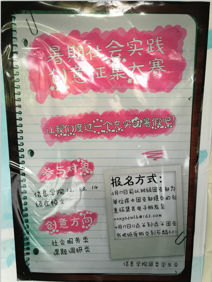为落实推进大学生素质拓展工程,培养信息学子的创新能力、实践能力和协作能力,信息学院团委在3月31日面向非毕业班学生开展了2015年暑期社会实践创意征集大赛。