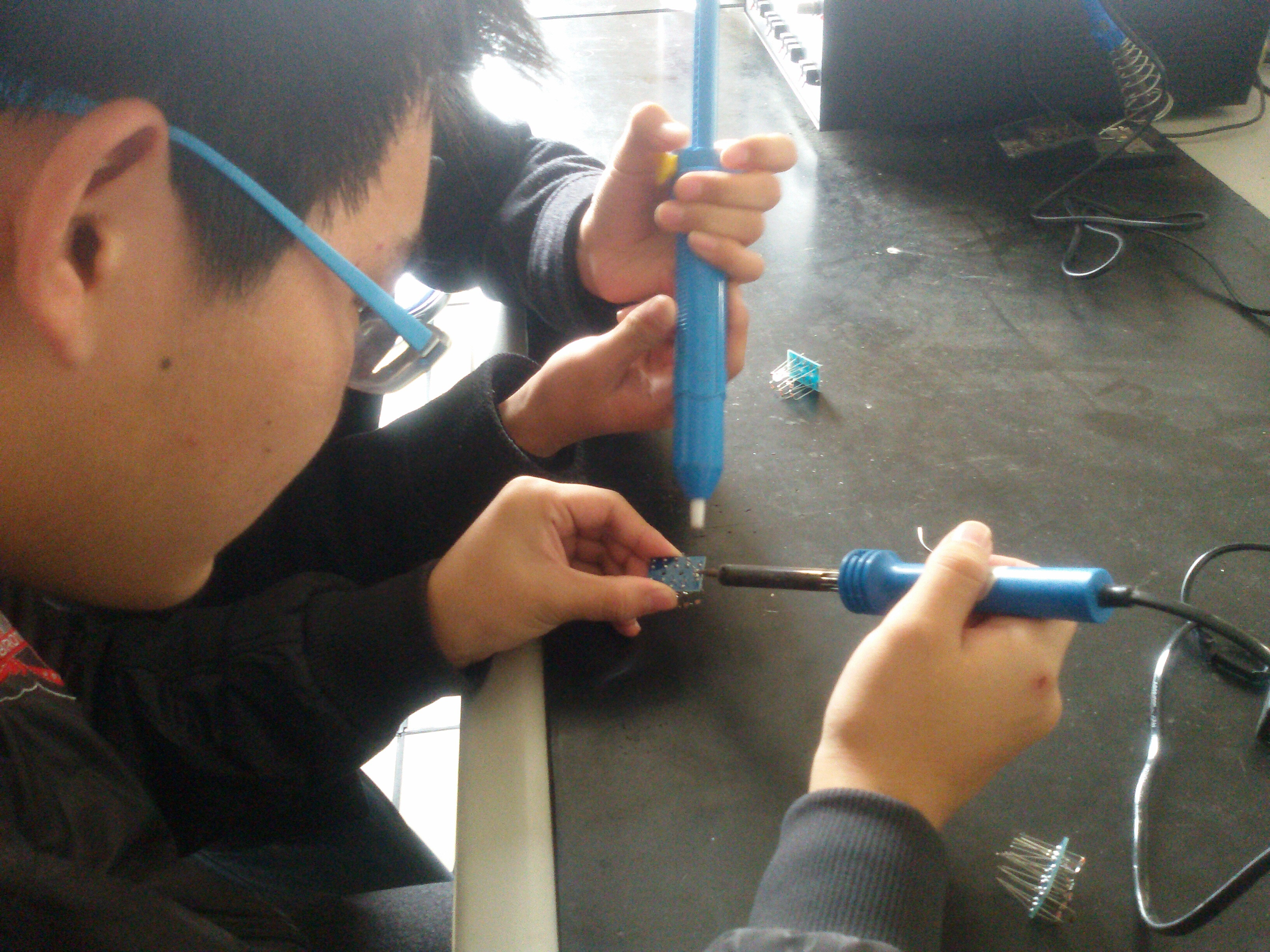 活动得到了无线电运动协会、计算机协会社员以及其他无线电爱好者的积极响应,活动正式开始前,802教室已经坐满了前来参加活动的同学。考虑到今年入学的新同学目前所学的专业知识不多,在活动开始前特意进行了包括电烙铁如何使用、在使用后拔出电源插头等安全教育,确保活动的安全性。介绍完原理之后,正式开始焊接。同学们首先要完成电阻串并联的焊接,领会焊接要领、技巧。在完成电阻串并联之后,要求同学们独立完成电阻阻值的读数。接着分发GSM检测电路各元器件,同学们独立完成焊接。焊接完毕之后,同学们对焊接完成的电路进行检测,不通过的检测分析失败原因。