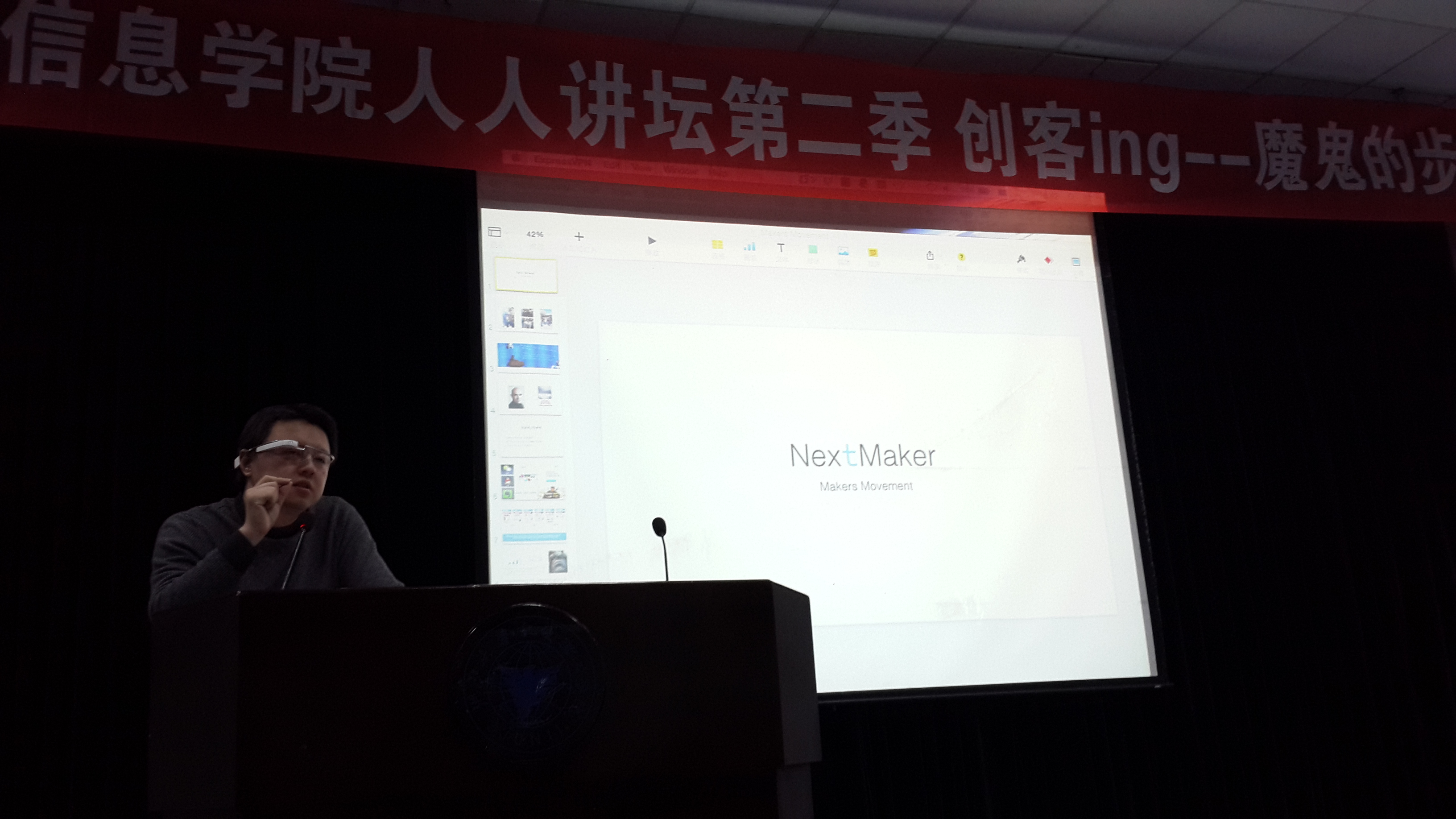 12月9日晚信息学院在NF103举办了第二季人人讲坛。本次讲坛以“创客”为主题,邀请到了五位资深“创客”作为主讲人,分别就各自的经历介绍了自己的创作过程。“创客”一词来源于英文单词“Maker”,是指不以盈利为目标,努力把各种创意转变为现实的人。