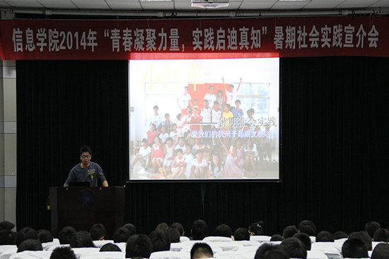 为推进2014年暑期社会实践工作,信息学院于4月23号晚上在NF103会议室举办了信息学院2014年“青春凝聚力量,实践启迪真理”暑期社会实践宣介会,参加宣介会的有学院团委副书记万树巍老师,2013年暑期社会实践优秀团队代表、2014级全体学生以及其他年级没有参加过暑期社会实践的学生。