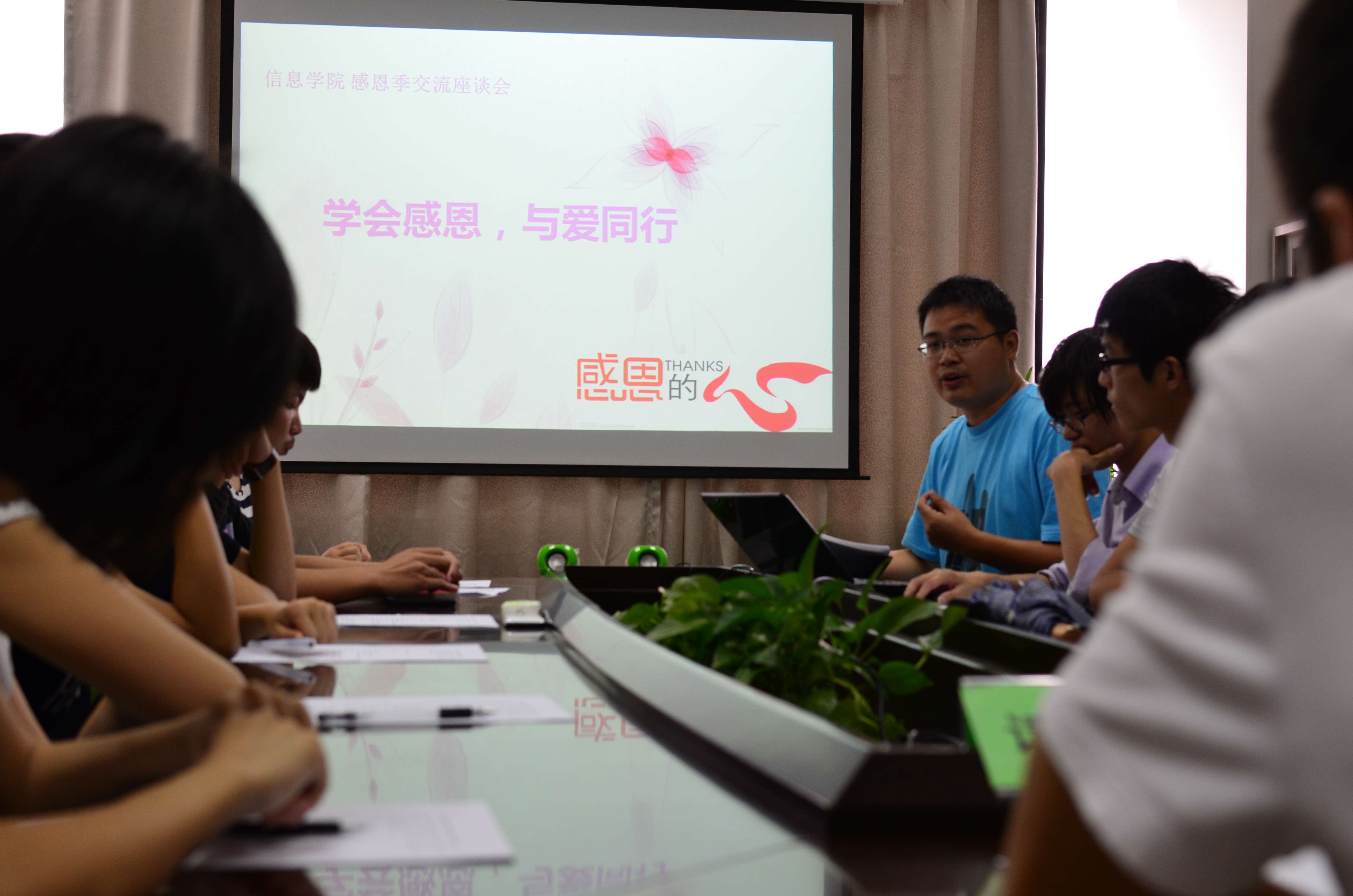 为进一步做好我校大学生资助工作,切实推进资助和育人相结合,响应我校组织开展“感恩季”系列活动,2013年6月28日下午,信息学院于石麟903-3召开“学会感恩,与爱同行”感恩季交流座谈会。辅导员王海波老师,国家励志奖学金、新丽奖助学金、彩虹助学金、弘毅奖助学金的获得者以及爱心基金资助的学生参加了座谈会。
