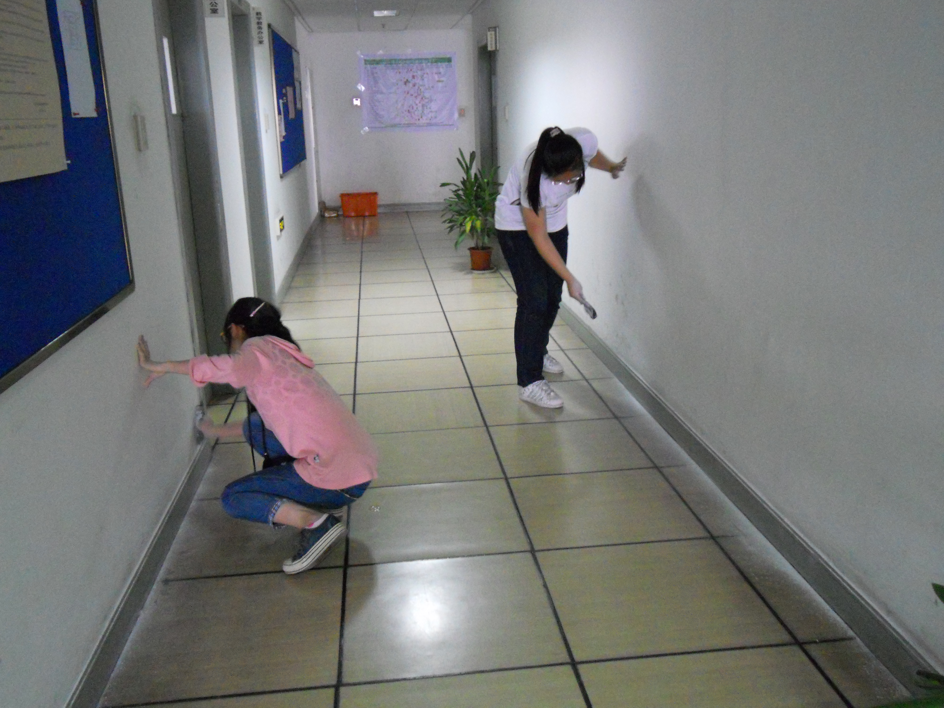 石麟大楼楼层多且墙壁上多有各种污渍,普通的清洗难以消除,针对这种状况,志愿者们进行了分组,并在组长的带领下,分层开始工作。志愿者们拿着手上的磨砂纸,一面又一面墙壁,一层又一层楼层,仔细清理着墙上的每一处污垢。清理完毕,组长带领志愿者们进行了检查,确保没有任何污垢被遗漏。