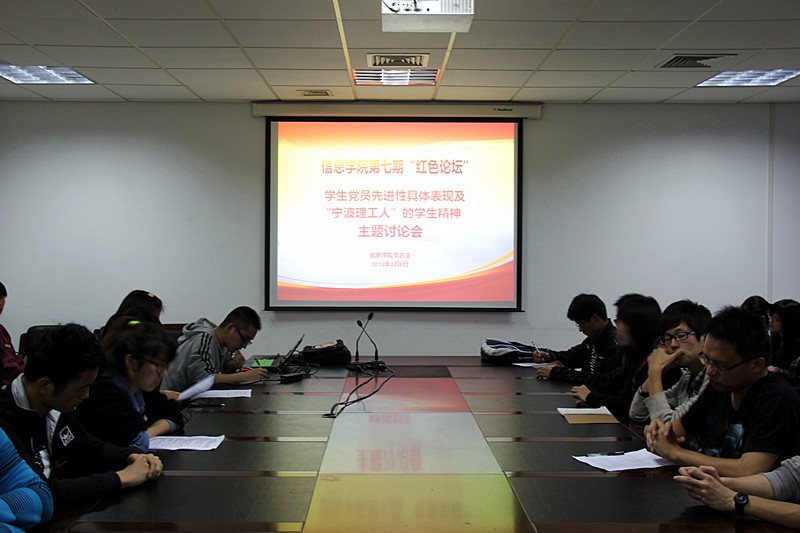5月8日晚6时,石麟大楼602会议室,座无虚席,气氛热烈。这里正在举办信息学院 “红色论坛”第七期主题讨论活动,讨论会以 “‘宁波理工人’的学生精神”和“学生党员先进性的具体表现”为主题。学院党总支组织委员、思政主管吴新林老师主持,本期预备党员培训班学员和团学干部代表参加了讨论会。