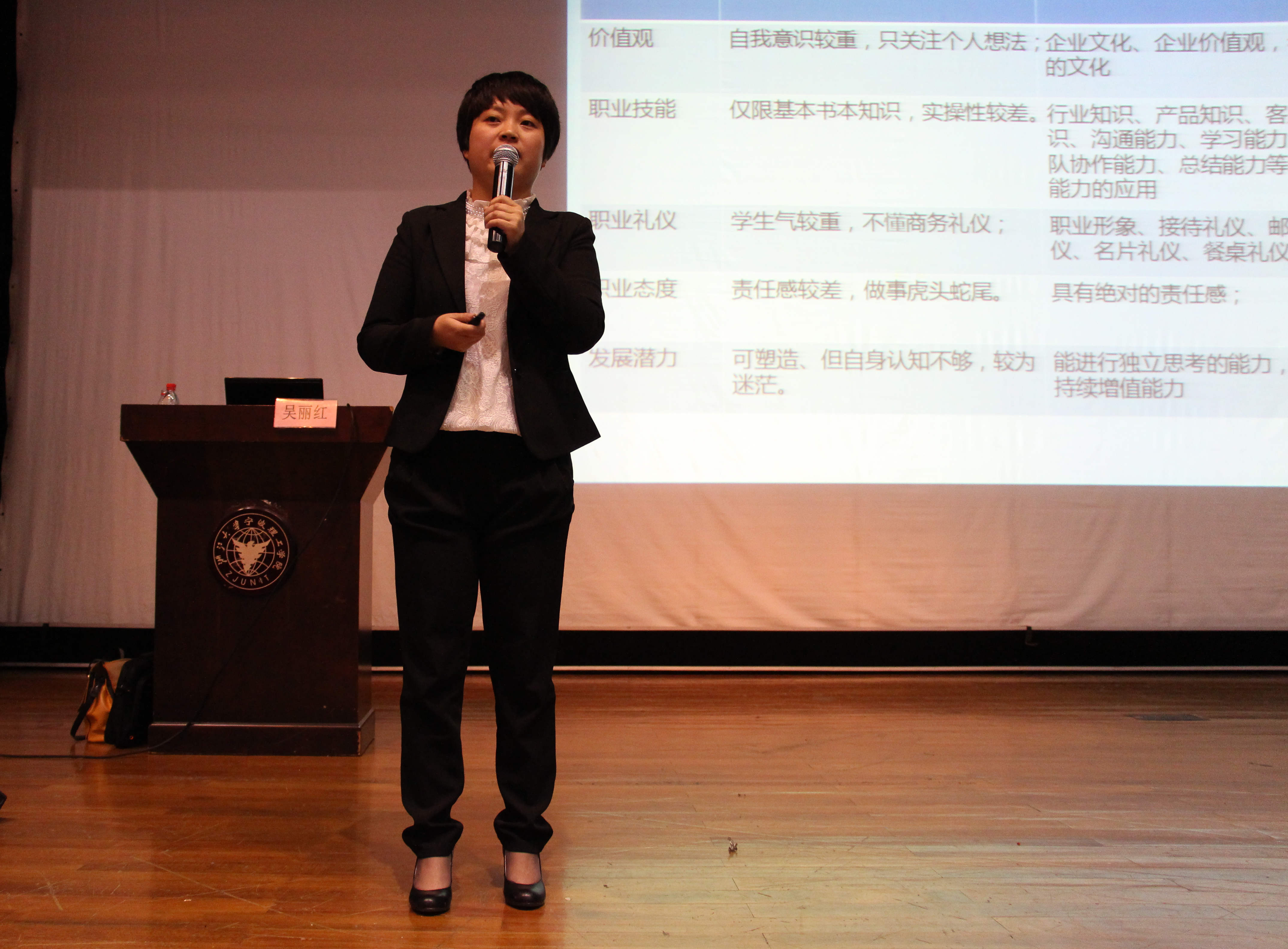 吴丽红经理主要从三个方面展开讲座,一、学生与职场人的区别,分别从价值观、职业技能、职业礼仪、职业态度和发展潜力来阐述了两者的区别。二、如何进入职场,通过分析四个学生的案例来展开讲述,重点讲了大学生进入职场前要选好行业和职业,进行准确的职业定位,而实习则是找准职业定位的捷径。三、如何进行职业化打造,主要从职业态度、职业形象、职业技能和职业礼仪四个方面展开。最后,吴经理希望大家能够通过自觉自省、自律自强和自我认同度过大学四年,并能够顺利完成由学生到职业人的角色转换。