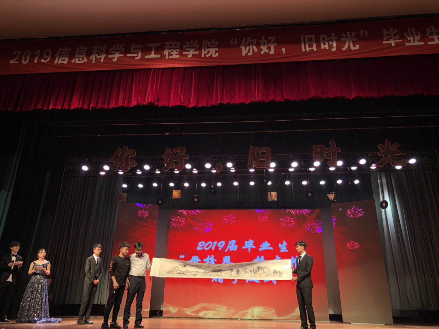 传媒舞蹈队的开场舞拉开了晚会的帷幕。晚会伊始,进行了信息学院2019届校友联络员聘任仪式和“母校恩,校友情”2019届毕业生纪念品赠予仪式。黄进院长为14名2019届校友联络员颁发聘书,胡超书记代表学院接受2019届毕业生代表赠礼。