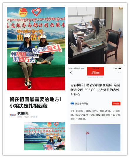 王竹圆,一位活泼率性的“宁波姑娘”,是一名优秀的学生党员,担任电信152班的团支书。2019年,临近毕业的王竹园在校园看到了“两项计划”的宣传横幅后,追着就业辅导员杜明珠老师咨询了许多相关的政策及报名条件,在家人及学院的支持下最终如愿成为“西藏两项计划志愿者”,开启了自己的援藏之旅。皑皑高原,王竹圆始终不忘初心,将自己的汗水挥洒在藏区;渺渺长空,她牢记“为人民服务”的信仰,扎根基层奉献青春,把共产党员的先锋精神带到了雪域高原。藏区自然环境恶劣,生活条件更是远远落后于家乡,但藏区人民的热情与淳朴打动了她,于是,她毅然决定留在西藏。2020年8月,王竹圆顺利考入了西藏自治区党委网信办,继续为藏区的发展做贡献。