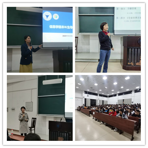 无规矩不以成方圆,帮助新生树立良好的规则意识,是确保学生顺利完成学业和做事做人的重要保障,为此,学院教务、学工积极联动,合作讲好规章制度的第一课。学院党办主任王媛媛详细剖析了学院“导师制”设立的背景和意义。为更好地适应学校转公发展,促进学院人才培养质量大幅提升,持续落实“教育为学生提升价值”的办学理念,发挥教师在学生培养中的主导作用和学生的主体作用,信息学院自2016级开始实施本科生导师制,本科生导师制通过对学生进行选课指导、学习计划指导、毕业设计指导以及就业指导等全方位工作,强化学生专业认可度,同时指导学生开展多种形式的科研训练和创新实践,培养学生的实践能力,提升学生综合竞争力。