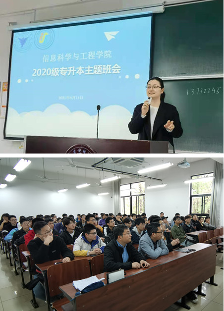 为推进专升本班级良好学风、班风建设,加强专升本学生学习、升学、就业指导, 4月14日上午,信息学院在NB230教室召开了2020级专升本班级主题班会。学院党委副书记方芳,信电系系主任蔡卫明,班导师方伟、朱勇,就业辅导员董俊娜老师参加了主题班会,就业辅导员董俊娜老师主持班会。