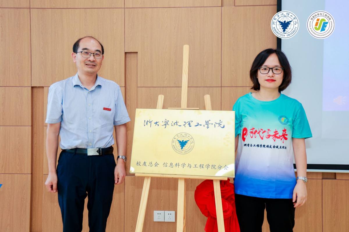 此次大会,选举产生浙大宁波理工学院校友总会信息科学与工程学院分会第一届会长、副会长、秘书长、副秘书长。副校长杨灿军向会长应中元授旗,与校友代表、副会长泮云萍揭牌。