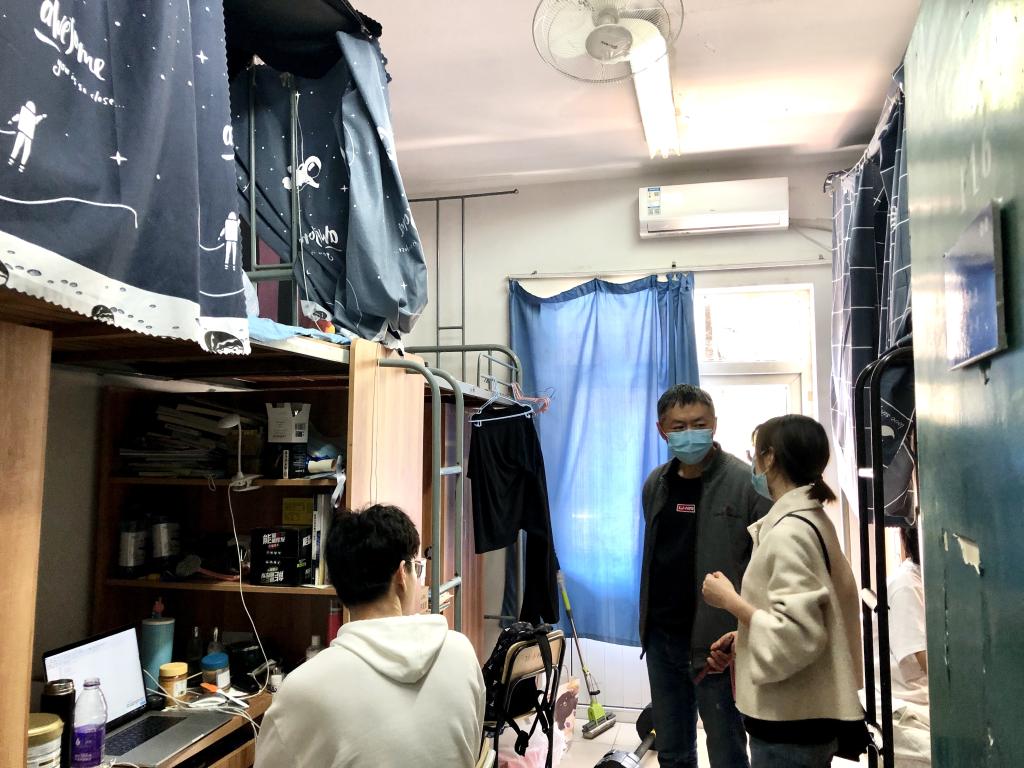 为了解公寓网格疫情管理分管楼幢工作落实情况,了解分管楼幢情况,与学生建立信任与联系,4月20日,学院党委副书记郑毅、全体辅导员等共同走访了25、26幢学生宿舍。