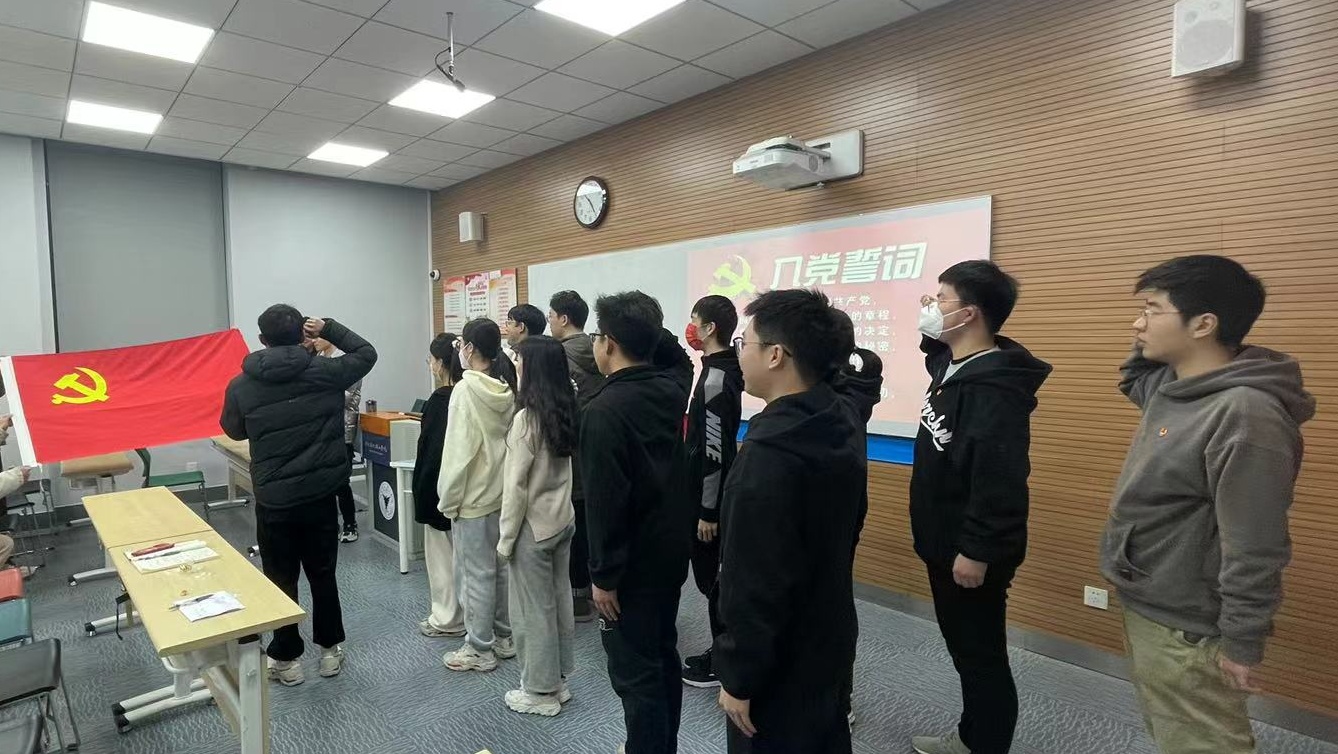 活动最后,学院为去年12月份新发展的党员同学举行宣誓仪式。电气学生党支部书记蒋鹏涛、辅导员李青倩为12名新党员佩戴上象征党员身份的党徽。