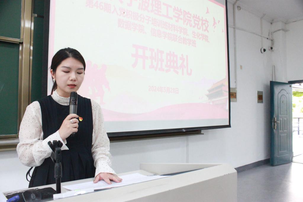 电子信息工程231班李欣悦作为党校新学员代表进行发言,她表达了对此次培训课程的重视和期待,希望通过这次培训,增进对党的认识,提高理论素养,进一步端正入党动机,并从三个方面向党组织做出承诺:一是以积极、认真的态度对待此次培训;二是遵守纪律,严格要求,积极汇报思想;三是主动完善自己,积极参加党组织活动,积极起到模范带头作用。