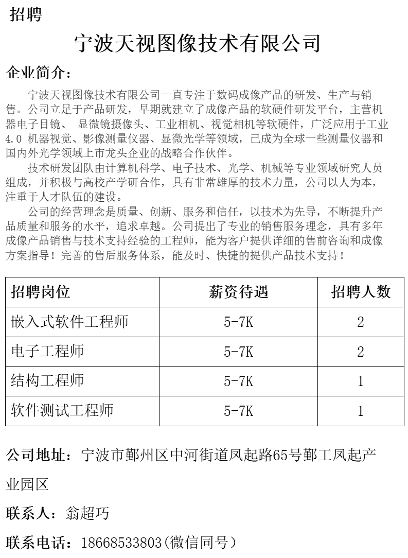 【招聘】宁波天视图像技术有限公司招聘简章