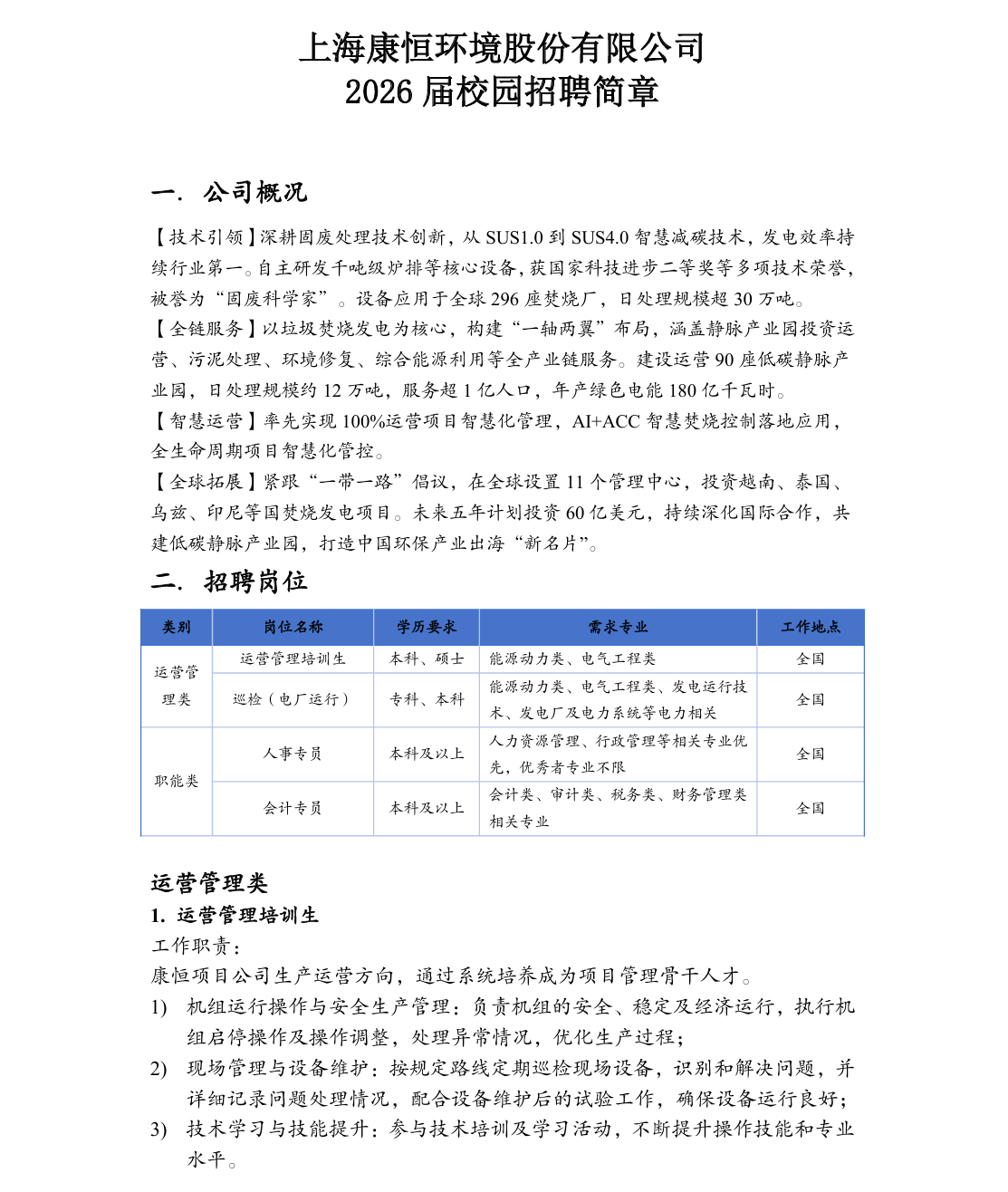 【招聘】上海康恒环境股份有限公司招聘简章